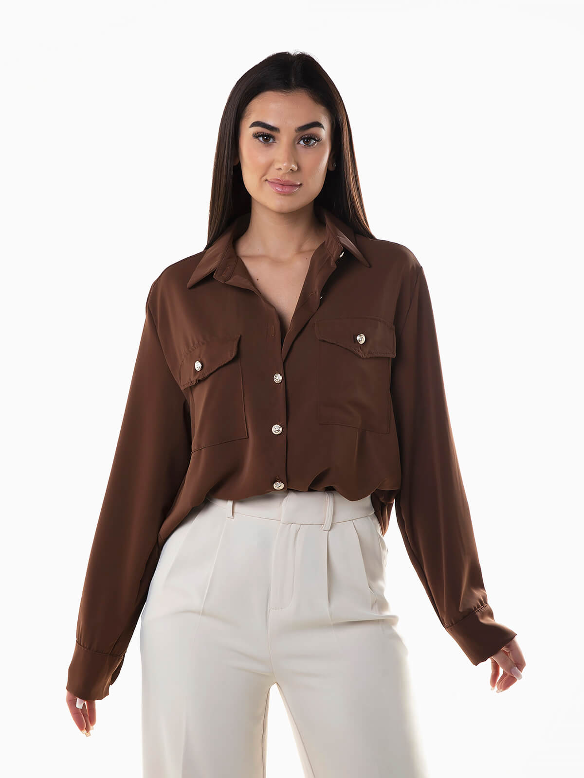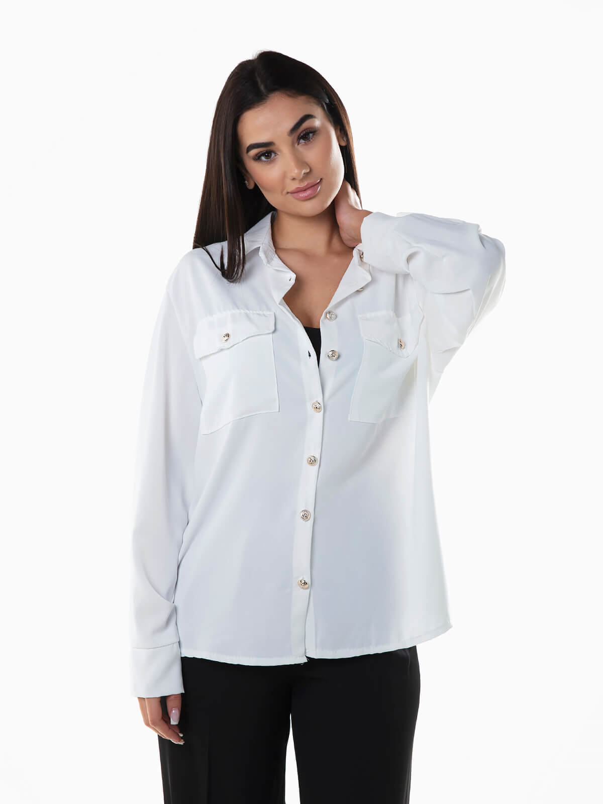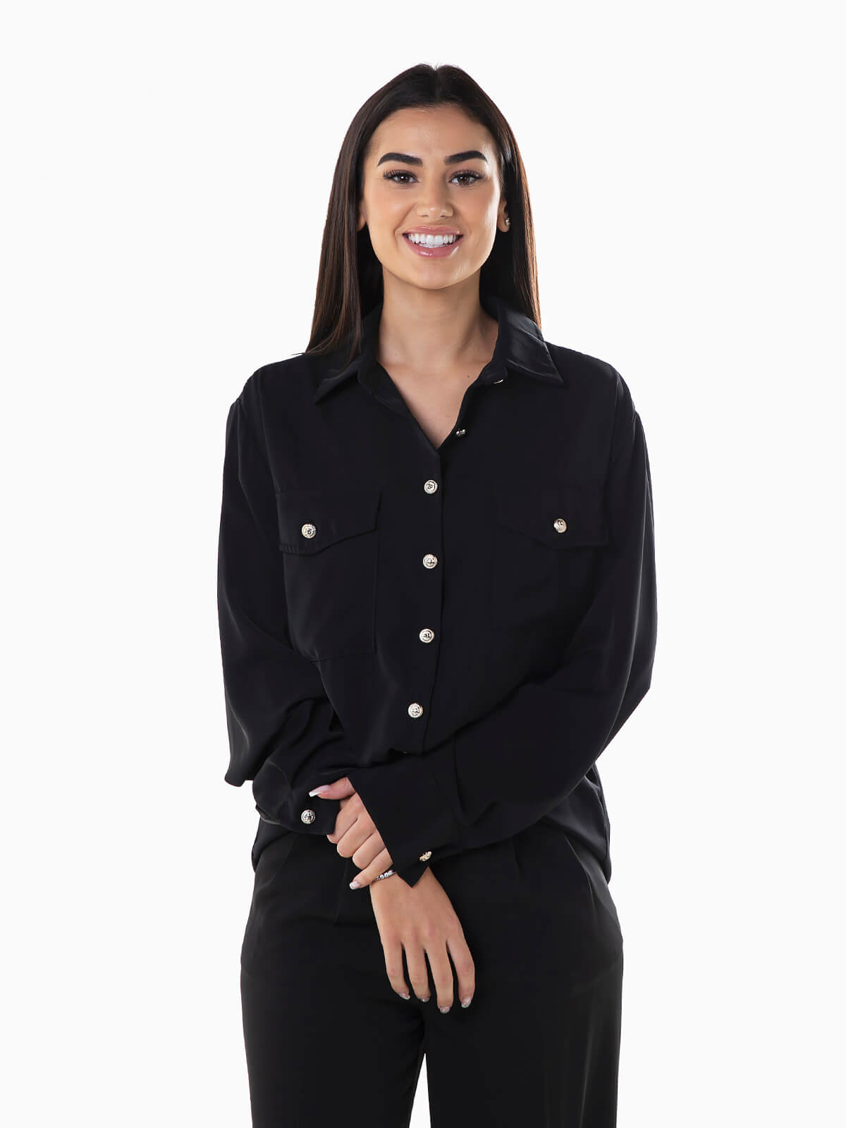Camisa fluída com 2 bolsos quadrados no peito. Camisa manga comprida com punhos abotoados. Gola abas. Cós arredondado mais comprido atrás. Aperto de botões dourados.
