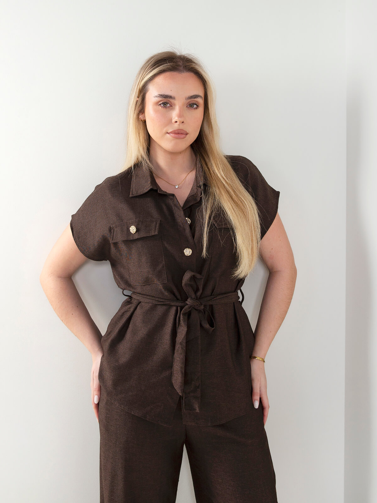 Camisa de manga curta com colarinho clássico, bolsos frontais e cinto ajustável que define a cintura. Os botões dourados acrescentam um toque sofisticado, tornando-a ideal para looks elegantes e atuais na meia estação, combinando com calças de alfaiataria ou jeans.