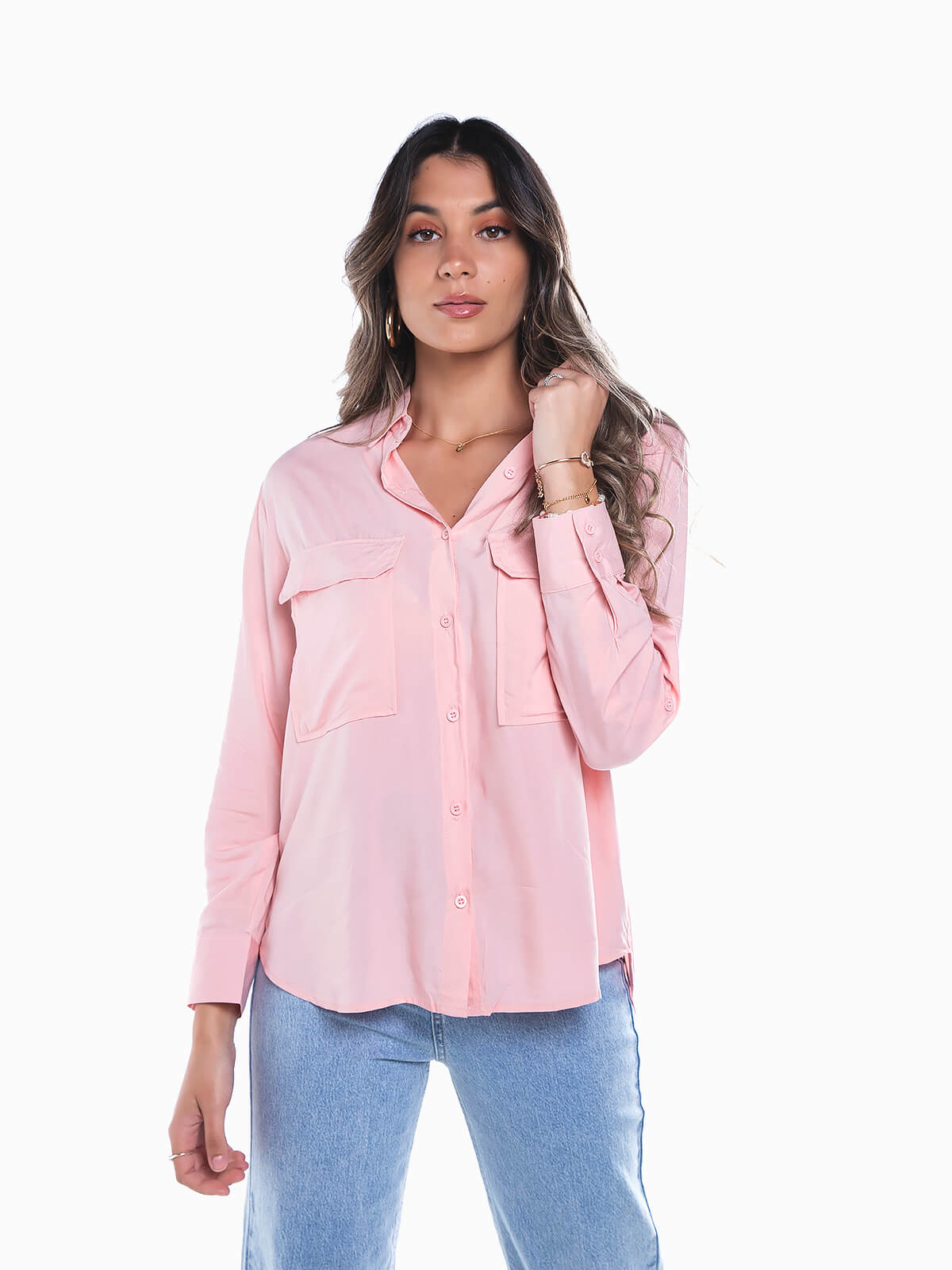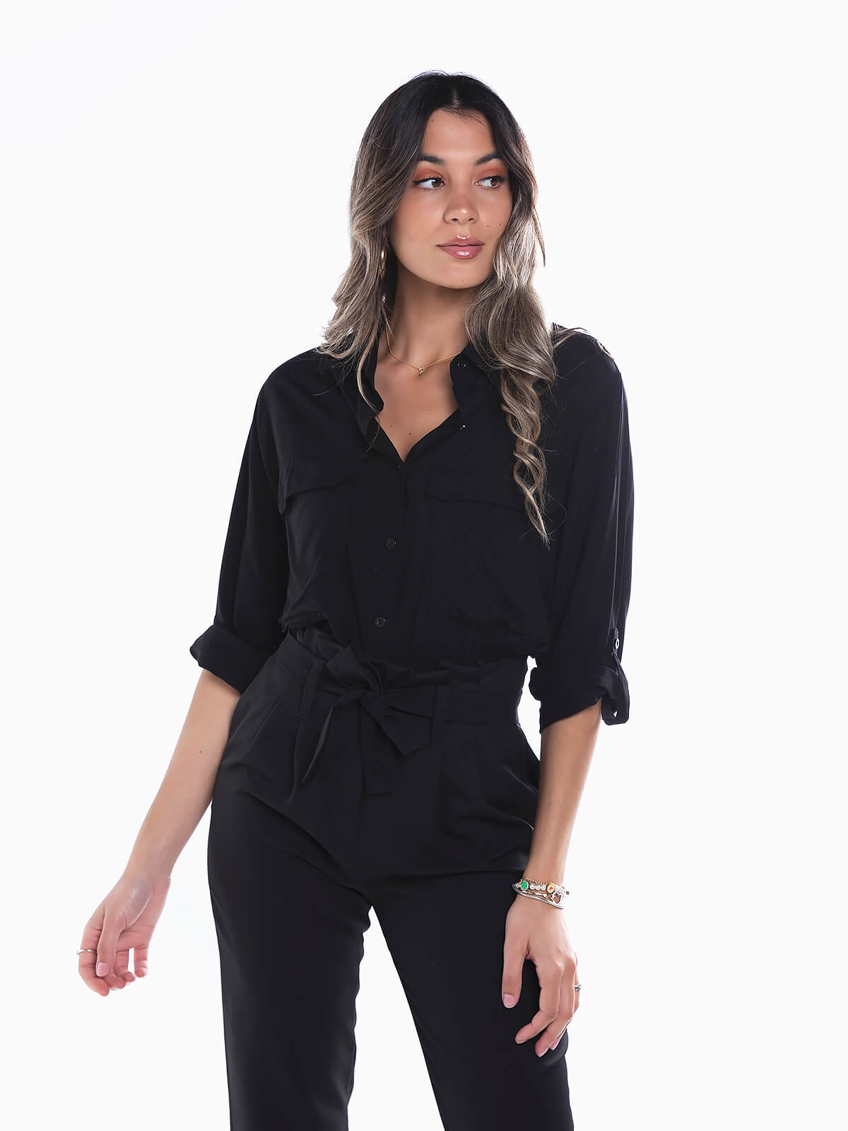 Camisa fluída com presilhas nas mangas. Camisa com bolsos aba no peito. Gola clássica. Tecido leve. Mais comprida atrás. Cós arredondado. Punhos abotoados.