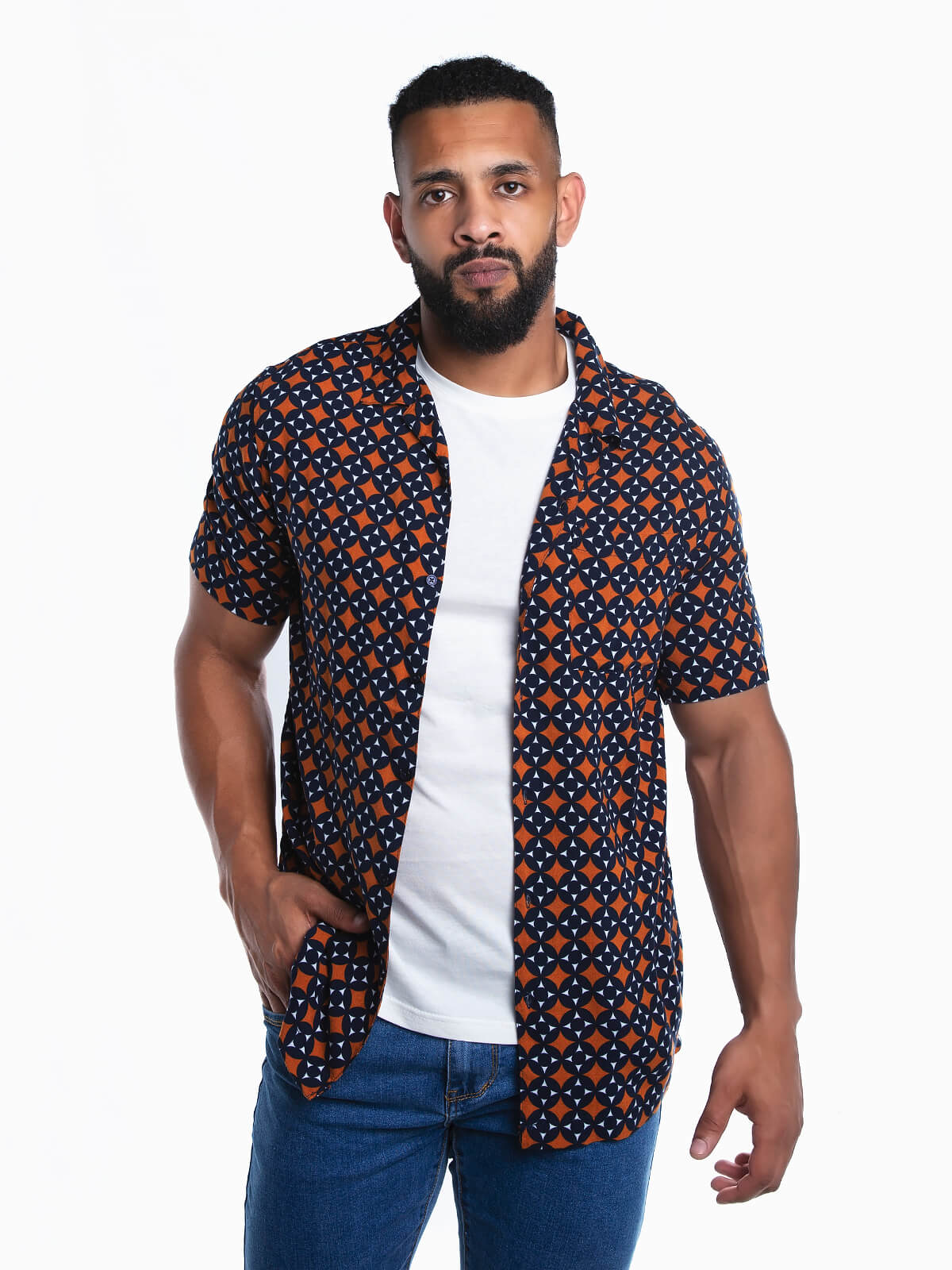 Camisa fluída de manga curta com estampado geométrico para homem. Camisa havaiana com gola bowling e bolso no peito. Aperto frontal de botões.