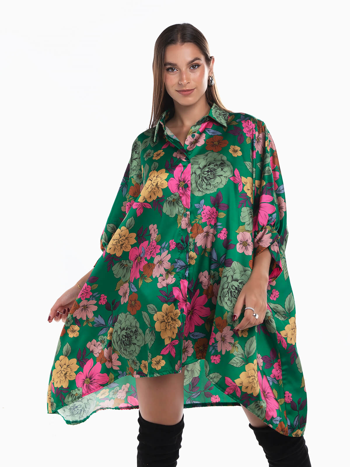 Camisa fluída verde com estampado floral para senhora. Camisa com manga morcego e gola de abas. Cós arredondado mais comprido atrás. Aperto frontal de botões.