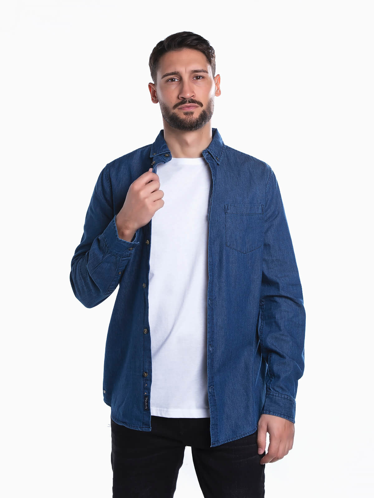 Camisa de ganga com bolso aplicado no peito. Camisa de manga comprida com punhos abotoados. Lavagem azul escuro. Gola clássica. Aperto de botões.