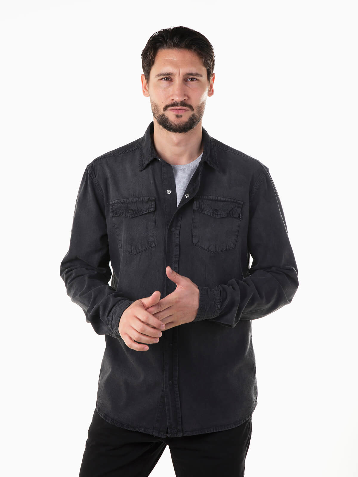 Camisa de ganga preta com dois bolsos no peito. Camisa denim leve de manga comprida com punhos abotoados. Gola abas. Aperto frontal de botões pressão.
