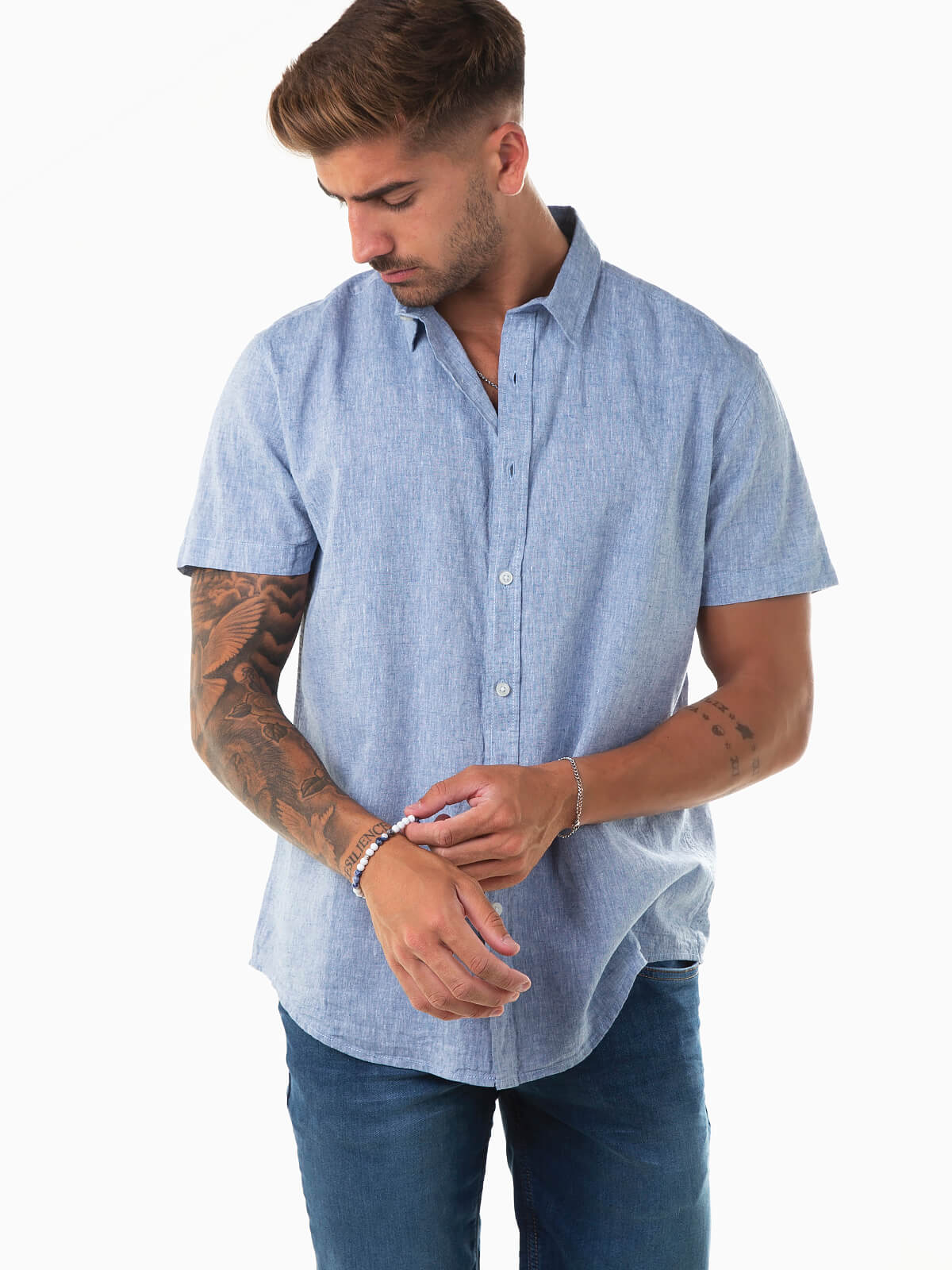Camisa manga curta confecionada em tecido linho com mistura de algodão para maior leveza e conforto. Camisa de verão com gola abas e aperto de botões.