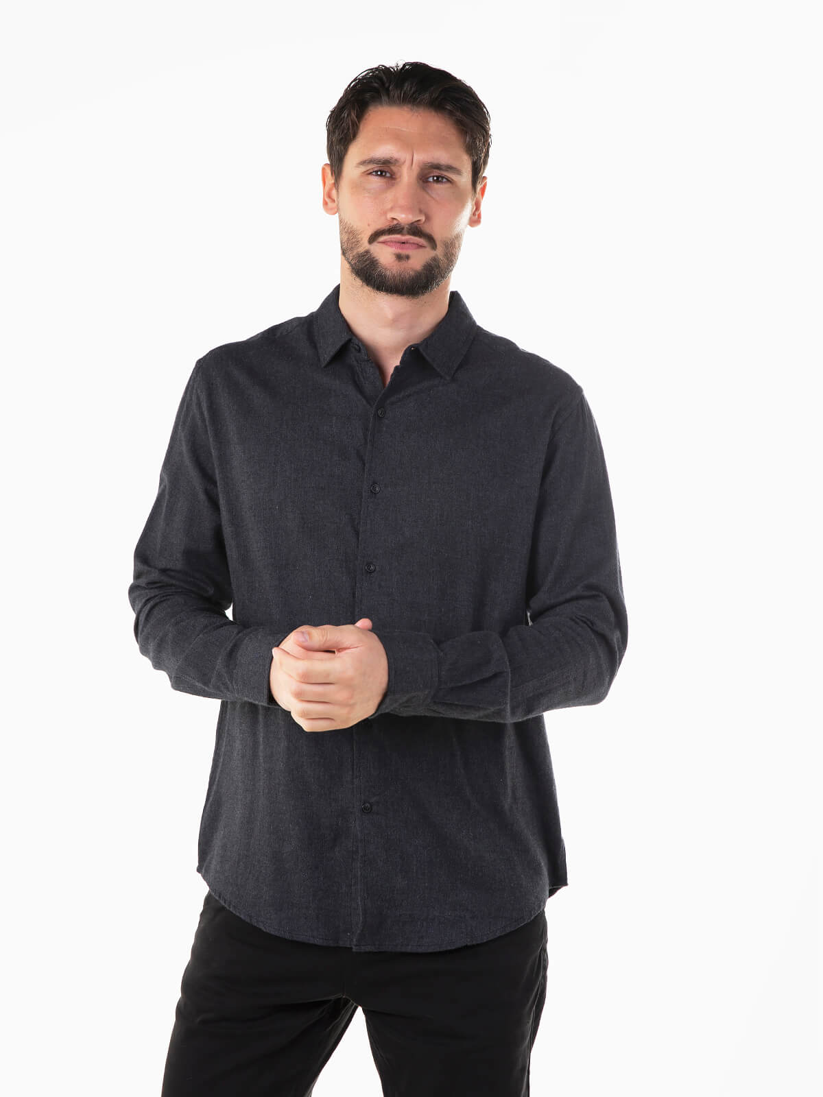 Camisa lisa de flanela 100% algodão confortável e agradável ao toque. Camisa de manga comprida com punhos abotoados. Gola abas. Aperto de botões.