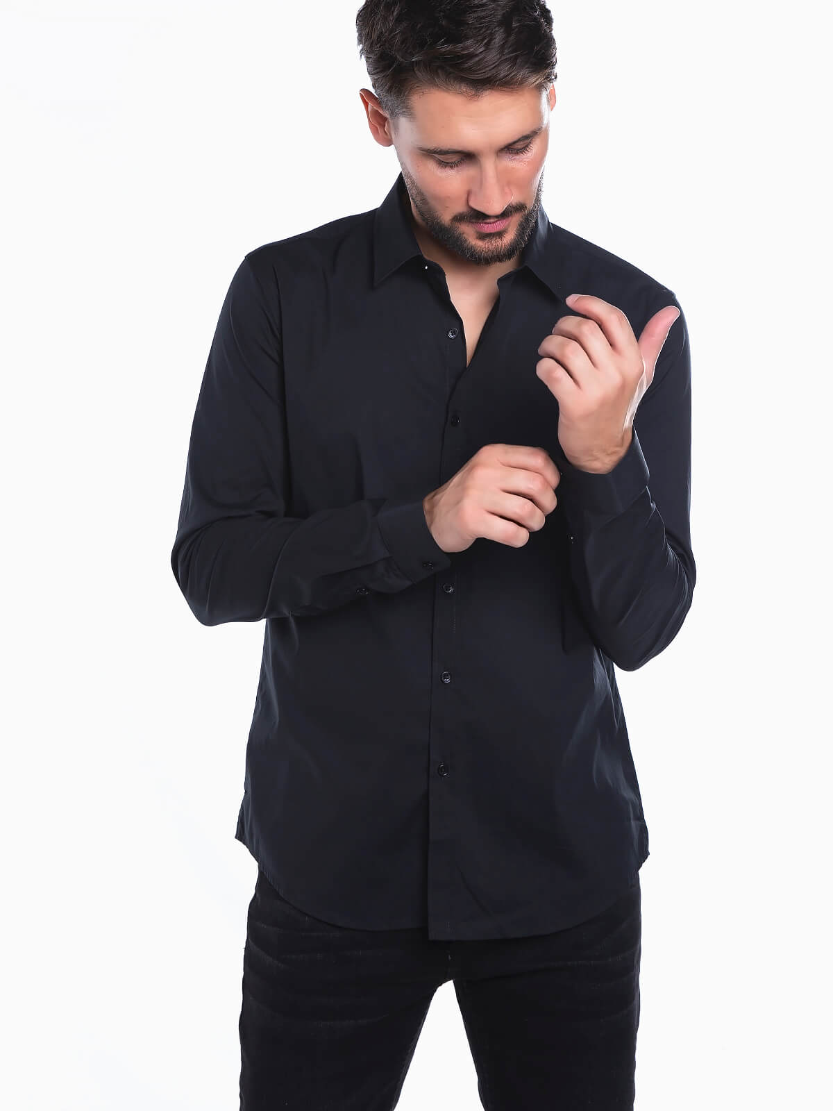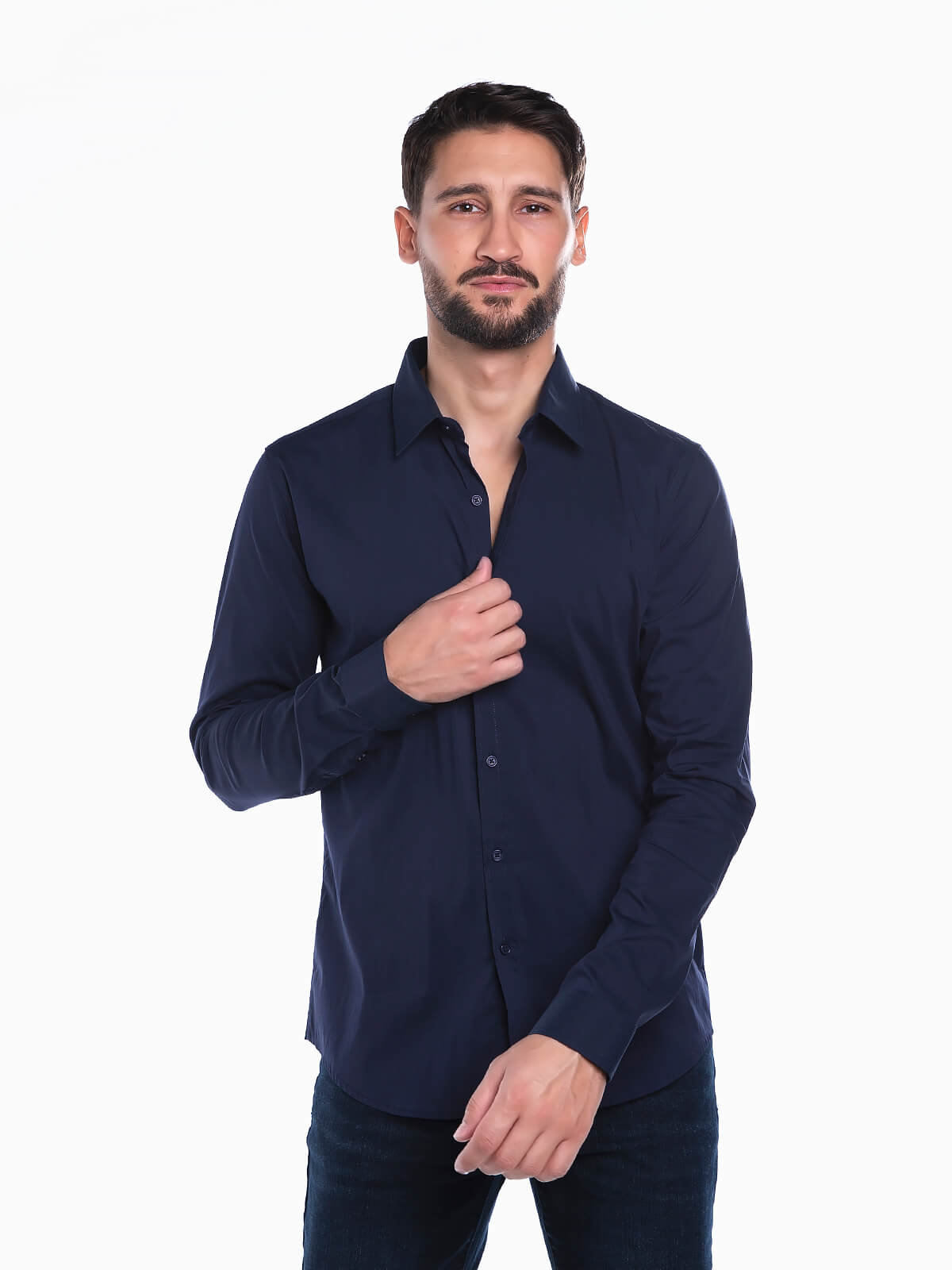 Camisa lisa regular fit em tecido elástico para homem. Camisa de manga comprida com punhos abotoados. Gola clássica. Aperto de botões.