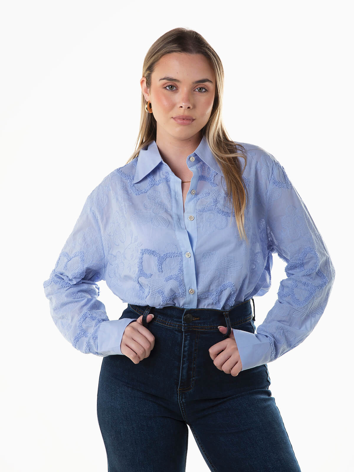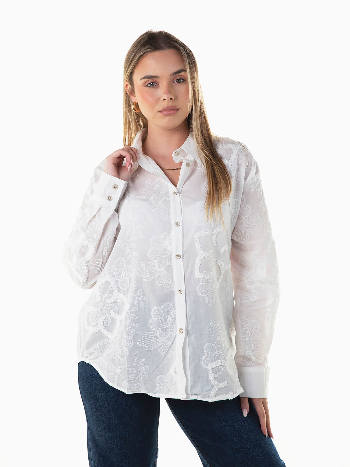 Camisa de manga comprida com pormenores bordados. Camisa com punhos abotoados e gola abas. Aperto frontal de botões.