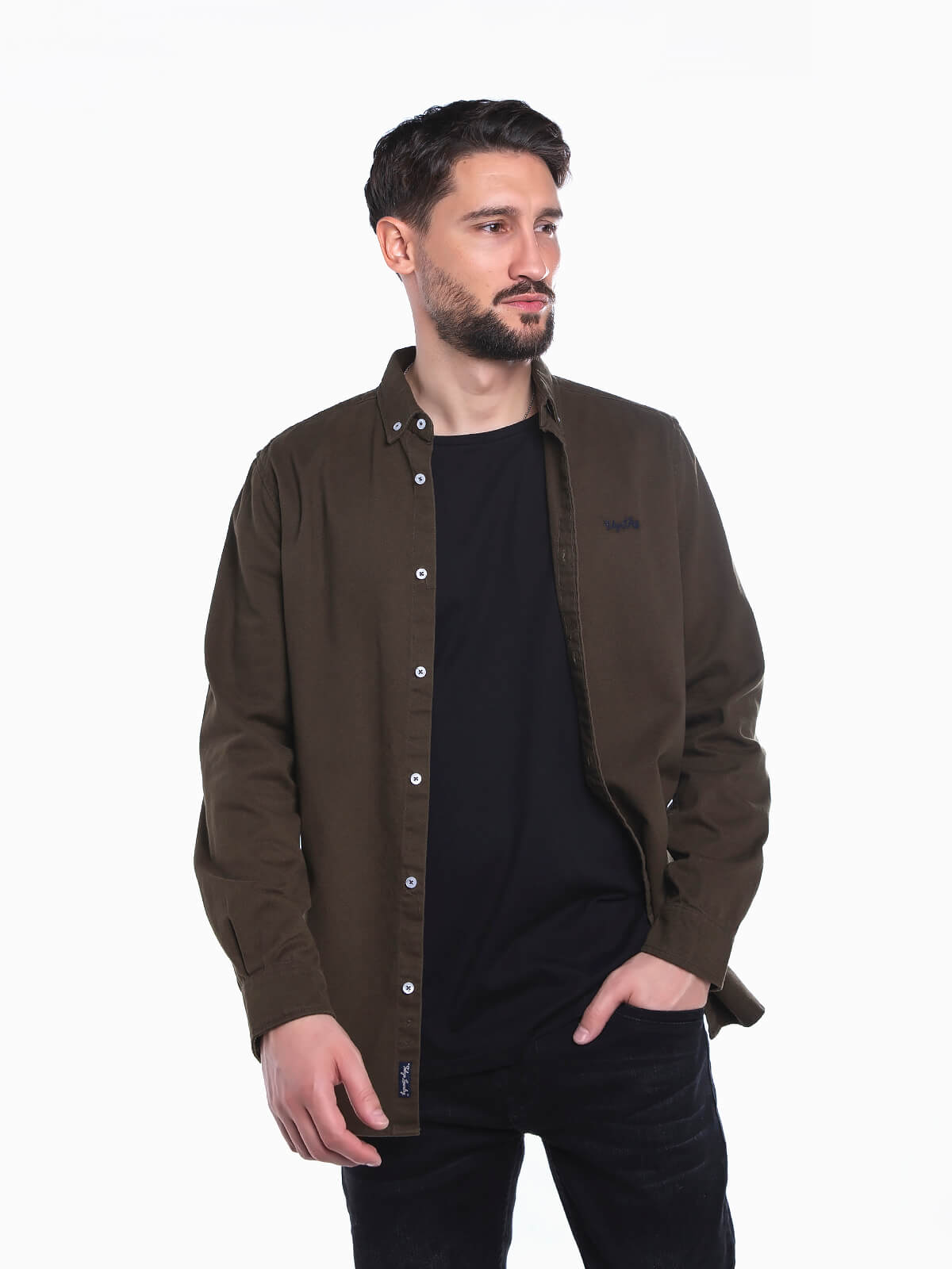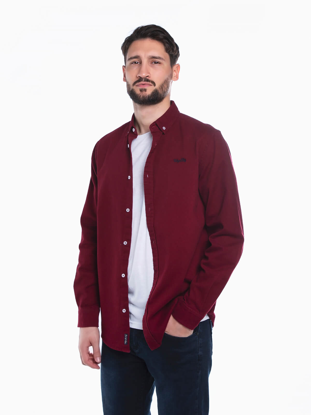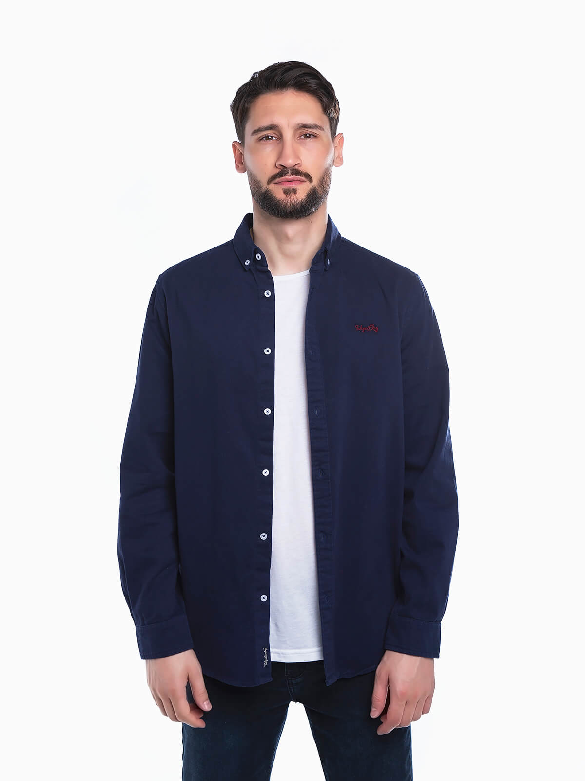 Camisa de manga comprida em sarja para homem. Camisa em tecido 100% algodão com bordado no peito e cós arredondado. Gola de abas. Punhos abotoados. Aperto frontal de botões em contraste.
