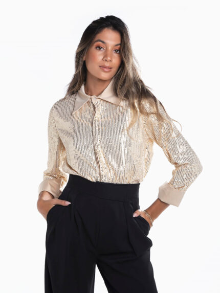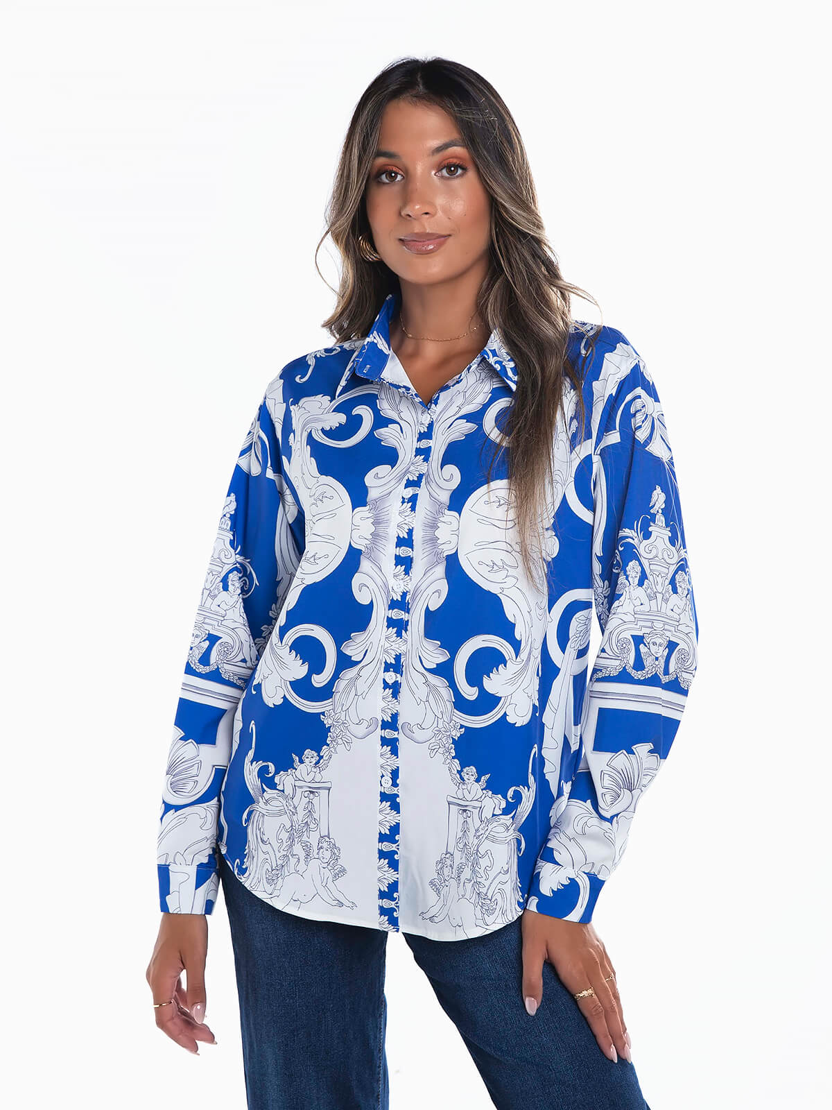 Camisa de manga comprida com estampado em contraste. Camisa para senhora com punhos abotoados. Gola de abas. Aperto frontal de botões.