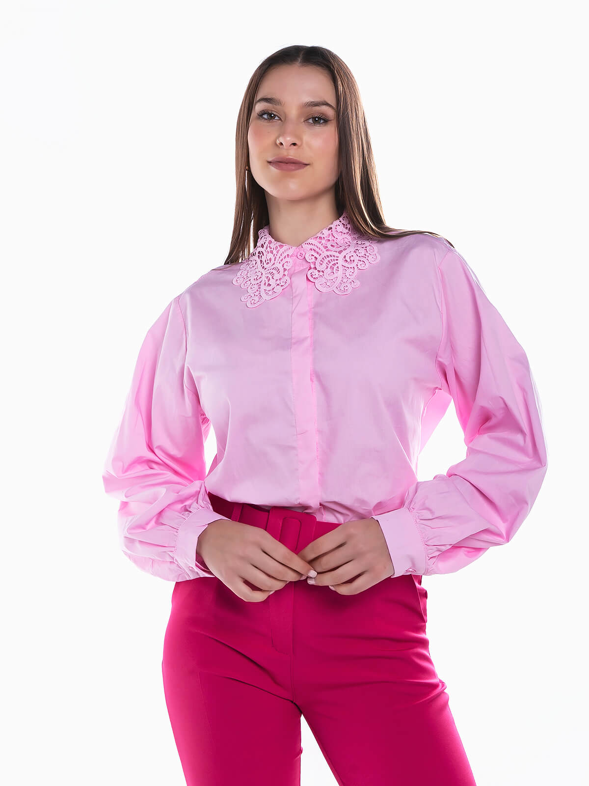 Camisa de manga comprida com gola crochet para senhora. Camisa em tecido 100% algodão com cós arredondado. Punhos abotoados. Aperto frontal de botões.