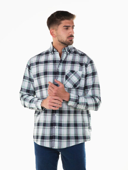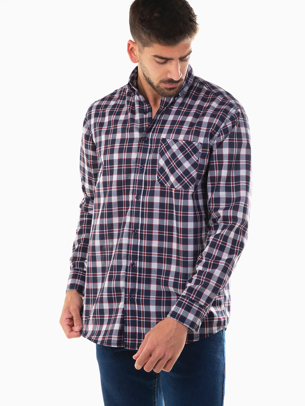 Camisa 100% algodão em xadrez azul marinho e bordeaux para homem. Camisa manga comprida com punhos abotoados e colarinho americano. Bolso no peito. Aperto frontal de botões.