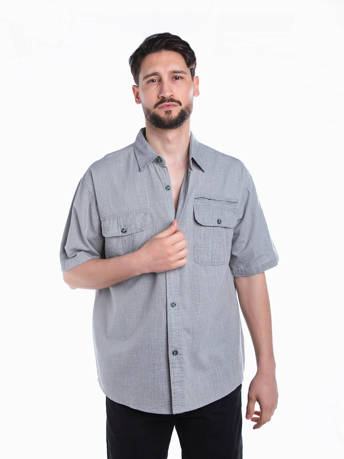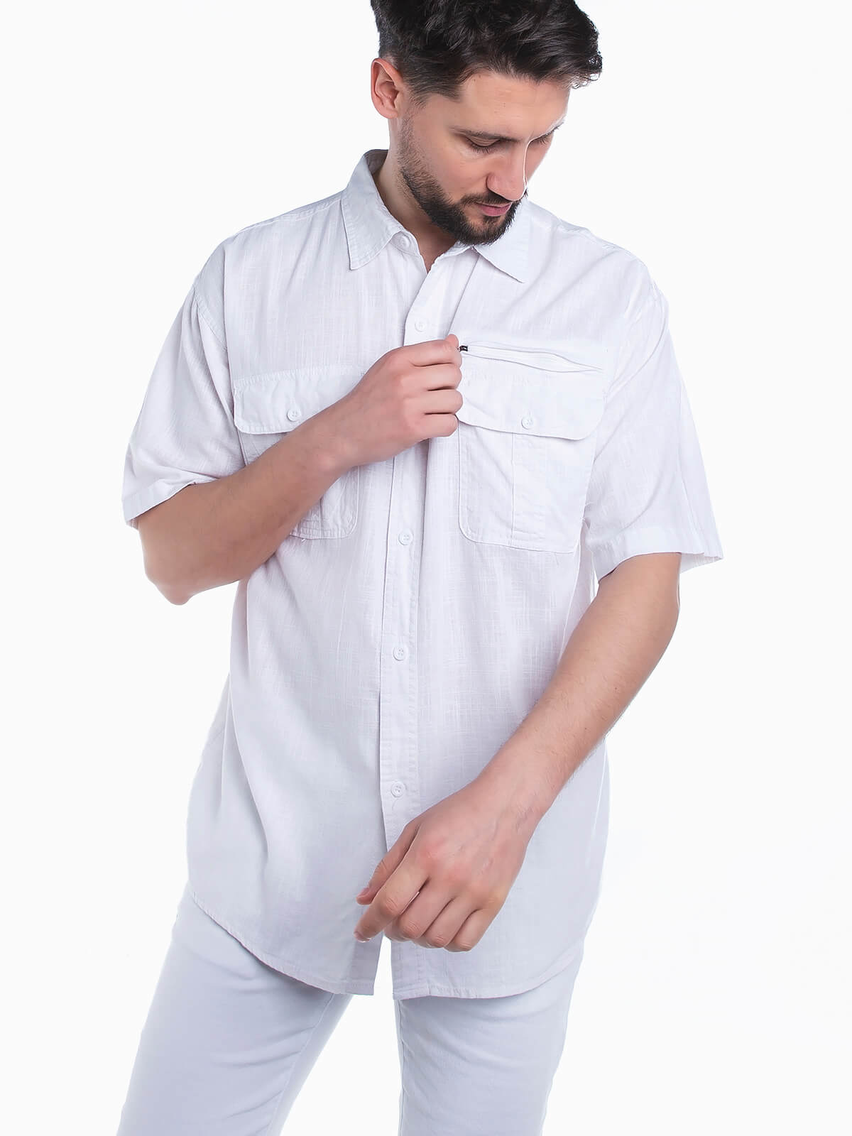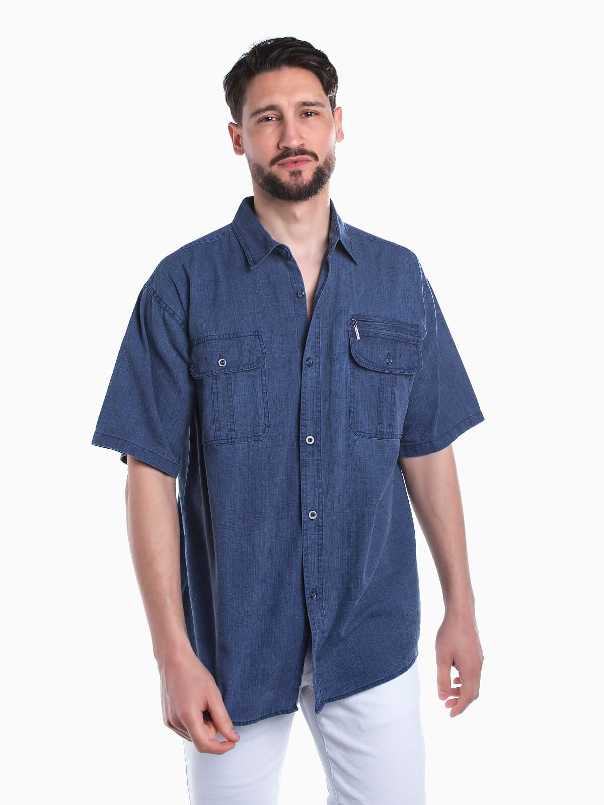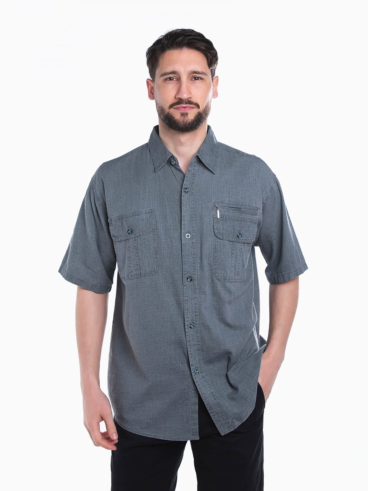Camisa de manga curta com bolsos no peito para homem. Camisa com textura e gola de abas. Aperto frontal de botões.