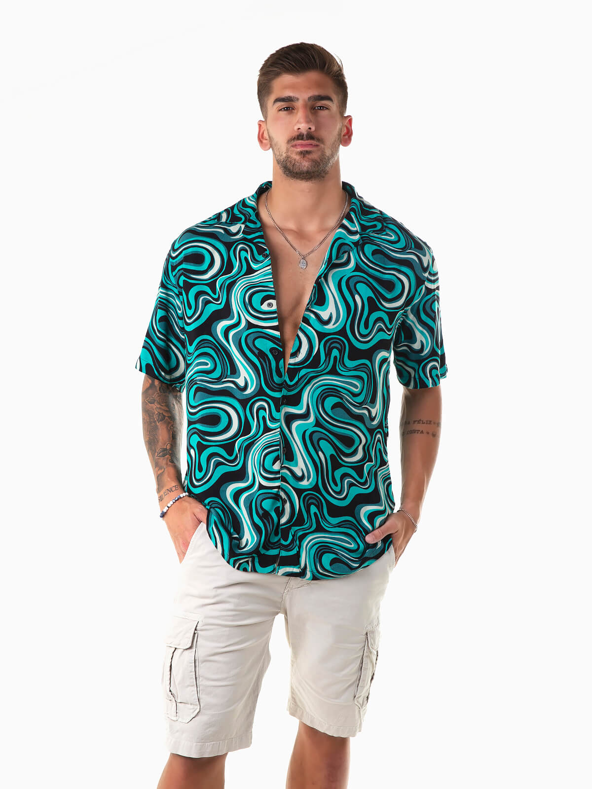 Camisa de manga curta com estampado ondulado para homem. Camisa confeccionada em viscose para maior conforto e respirabilidade. Colarinho bowling e aperto de botões.