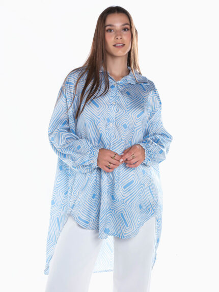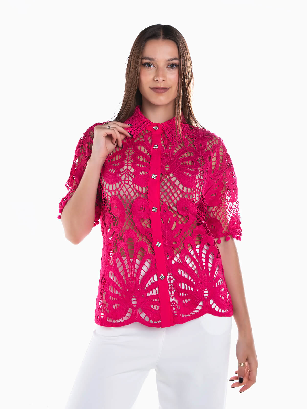 Camisa manga curta em crochet para senhora. Camisa com pormenor de pompons nas mangas. Gola de abas. Aperto de botões jóia.
