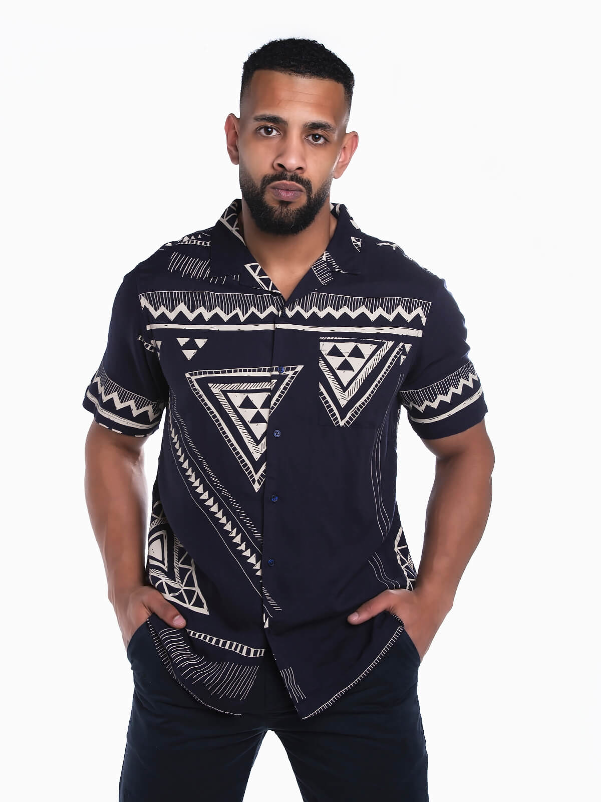 Camisa de manga curta com estampado étnico para homem. Camisa fluída com gola bowling. Bolso no peito. Aperto frontal de botões.