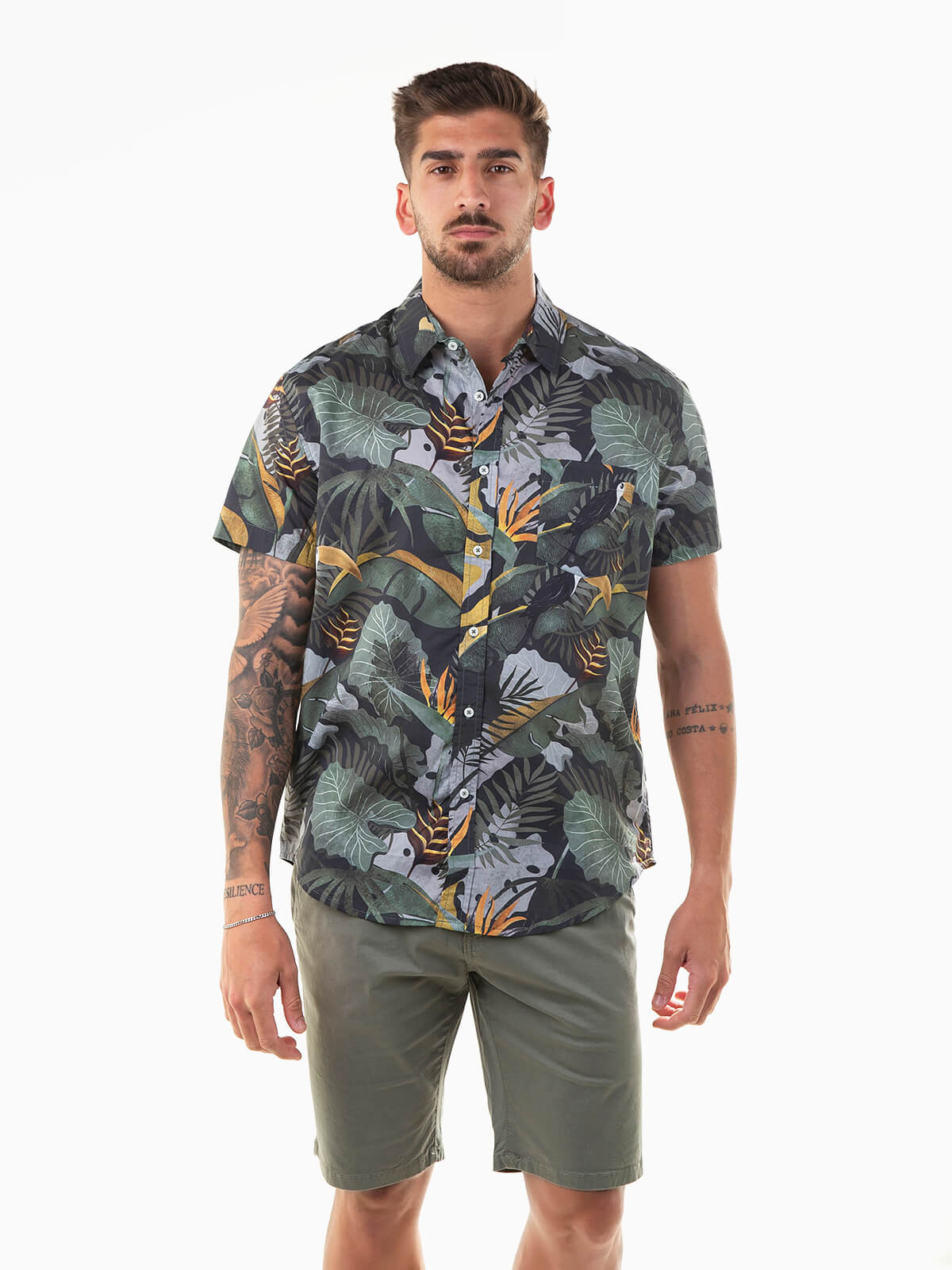 Camisa manga curta 100% algodão para homem. Camisa de verão com estampado tropical e gola abas. Bolso no peito. Aperto frontal de botões.