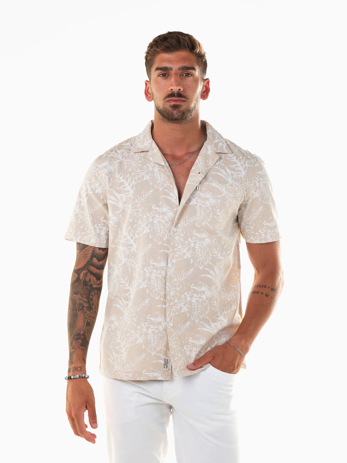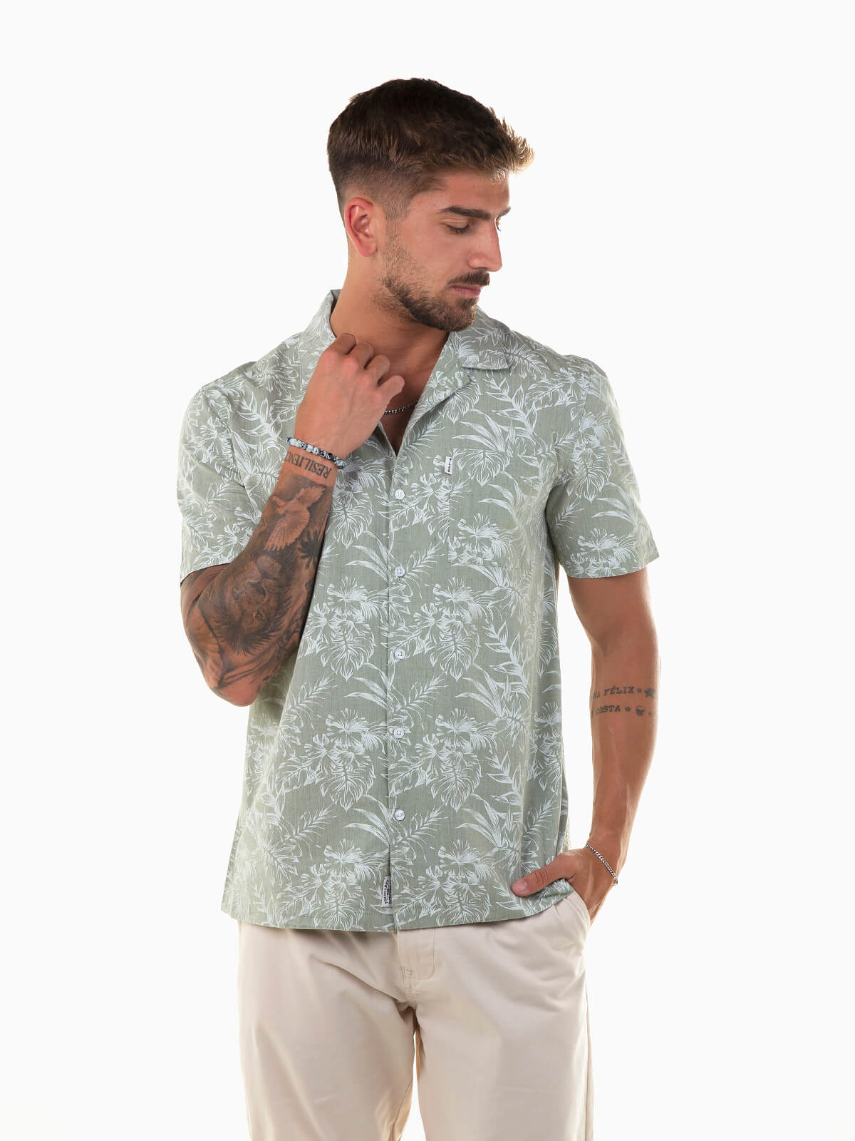 Camisa de manga curta com estampado veranil para homem. Camisa 100% algodão com bolso no peito. Gola de abas e aperto frontal de botões.