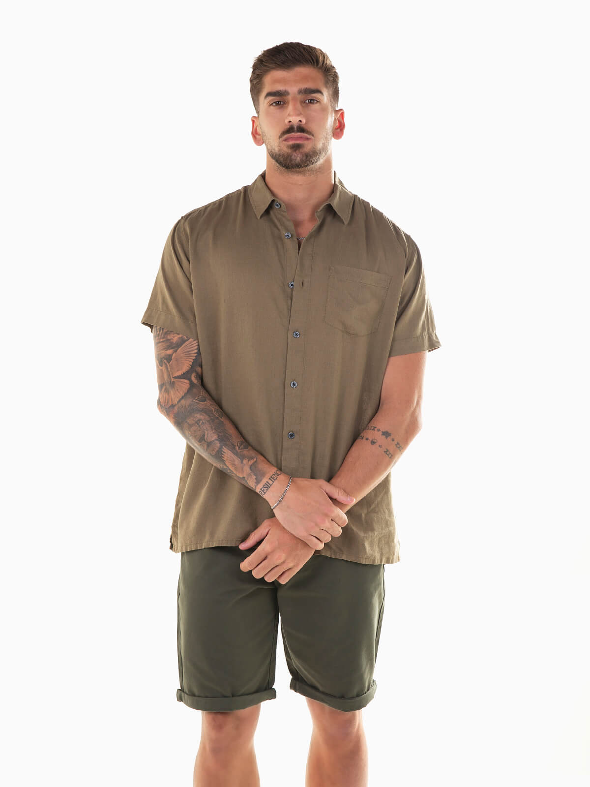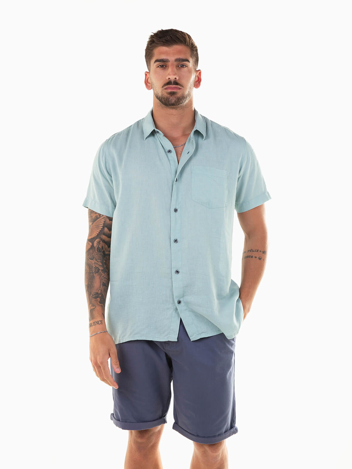 Camisa manga curta em tecido com mistura de linho e viscose ideal para os dias mais quentes. Camisa de verão com bolso no peito e gola bowling. Aperto frontal de botões.