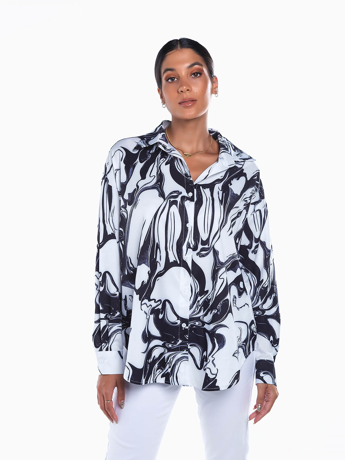 Camisa corte oversize com marble print para senhora. Camisa de manga comprida com punhos abotoados e cós arredondado. Gola de abas. Aperto frontal de botões.