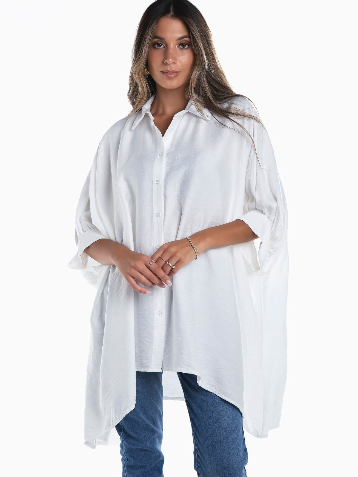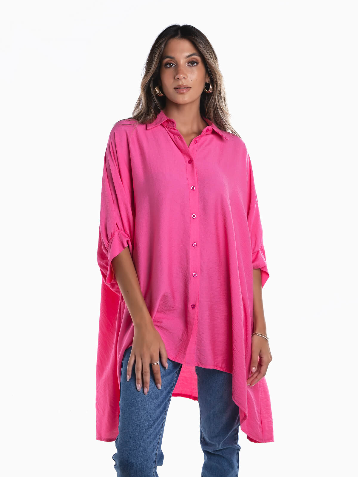 Camisa oversized com manga 3/4 para senhora. Camisa fluída com cós mais comprido atrás. Gola de abas e aperto frontal de botões.