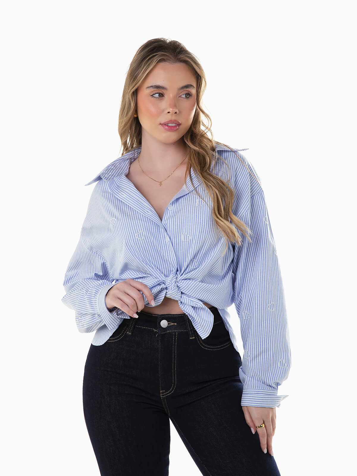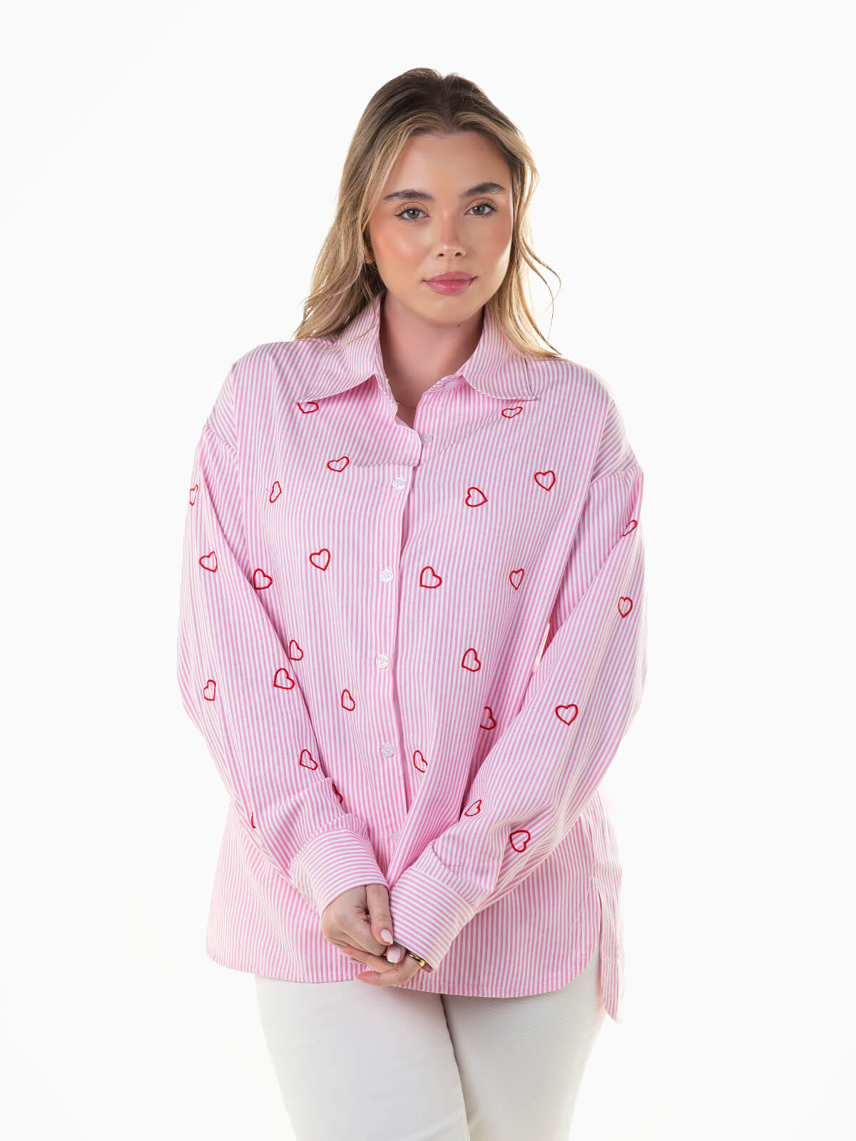 Camisa oversized às riscas com corações bordados em contraste. Camisa de manga comprida com punhos abotoados e gola abas. Aberturas laterais na base. Aperto de botões.