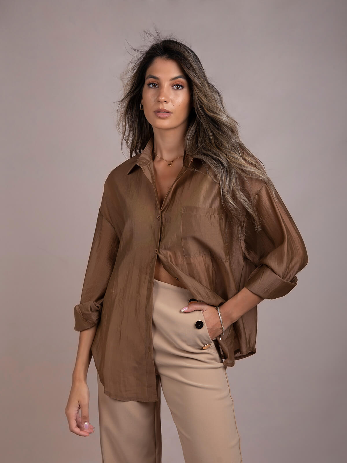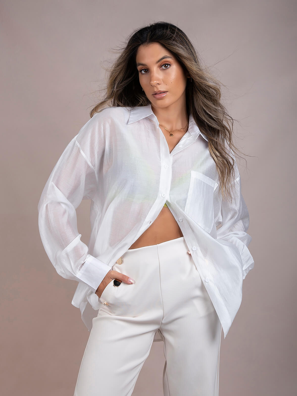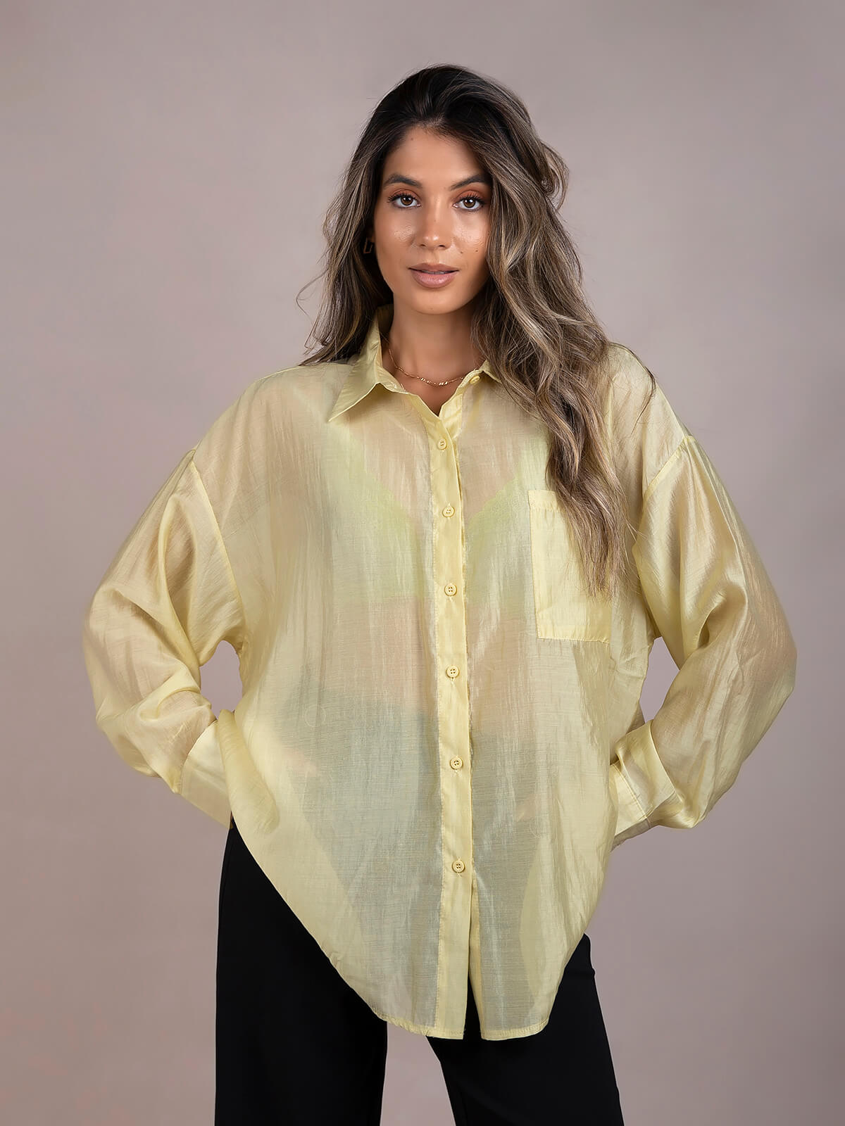 Camisa oversized semitransparente para senhora. Camisa manga comprida em tecido brilhante com bolso no peito e punhos abotoados. Gola de abas. Aperto frontal de botões.