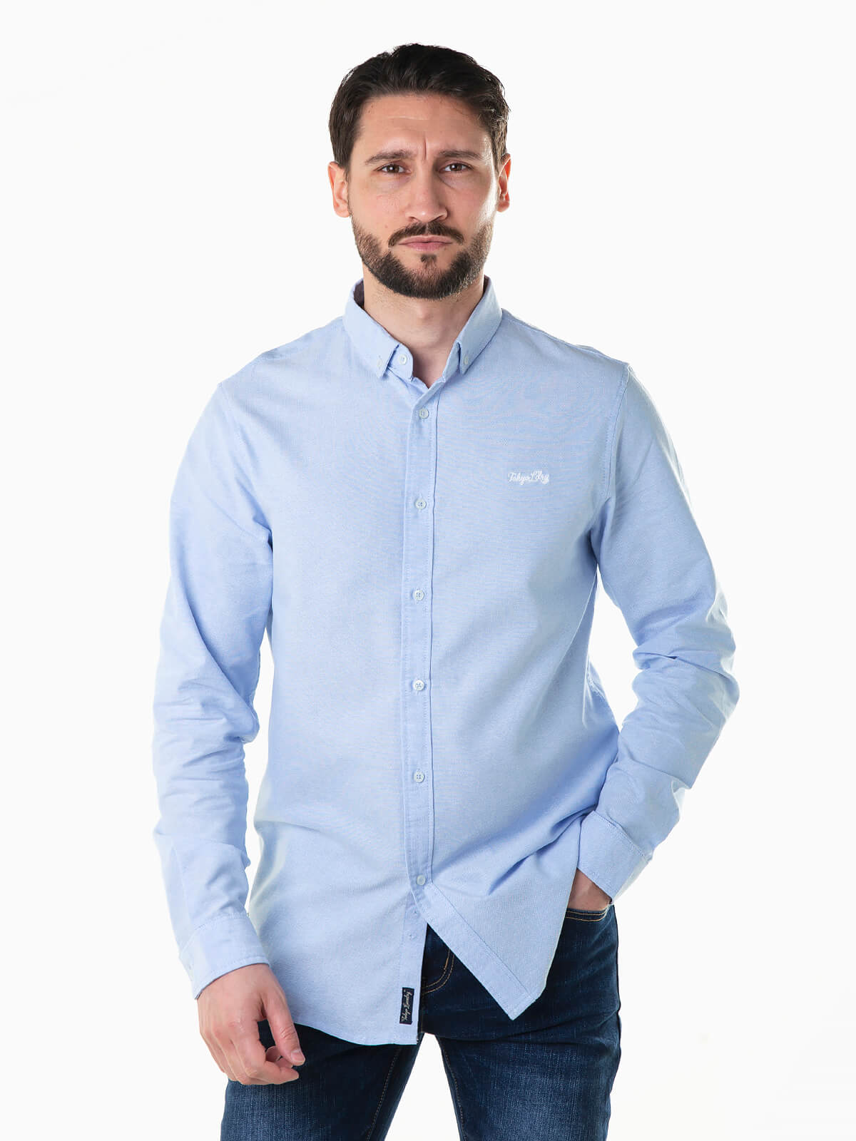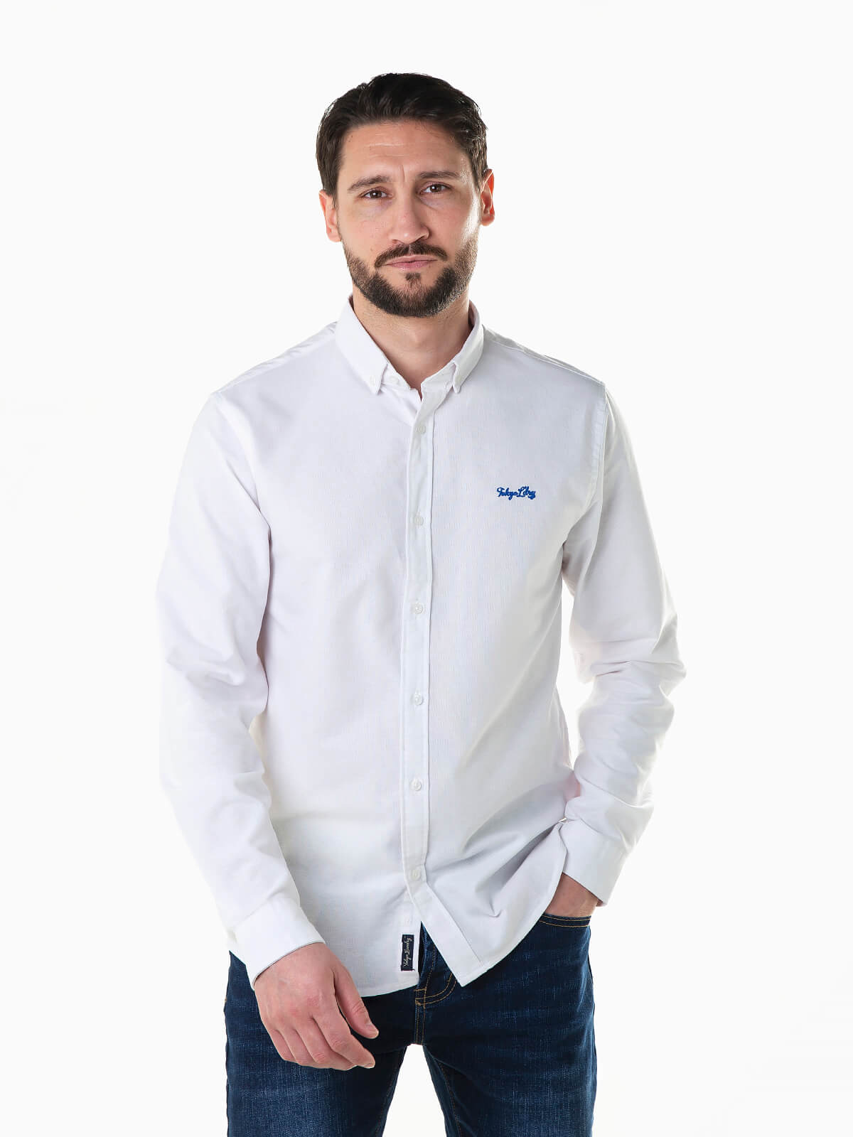Camisa 100% algodão Oxford resistente com bordado no peito para homem. Camisa manga comprida com punhos e gola abotoados. Colarinho de abas. Aperto de botões.