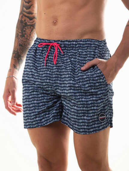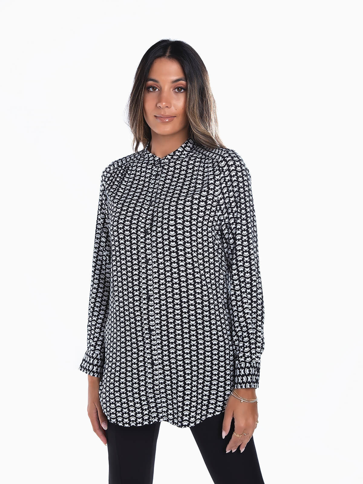 Camisa preta com estampado geométrico para senhora. Camisa de manga comprida com punhos abotoados. Comprida. Gola mao. Aperto frontal de botões.