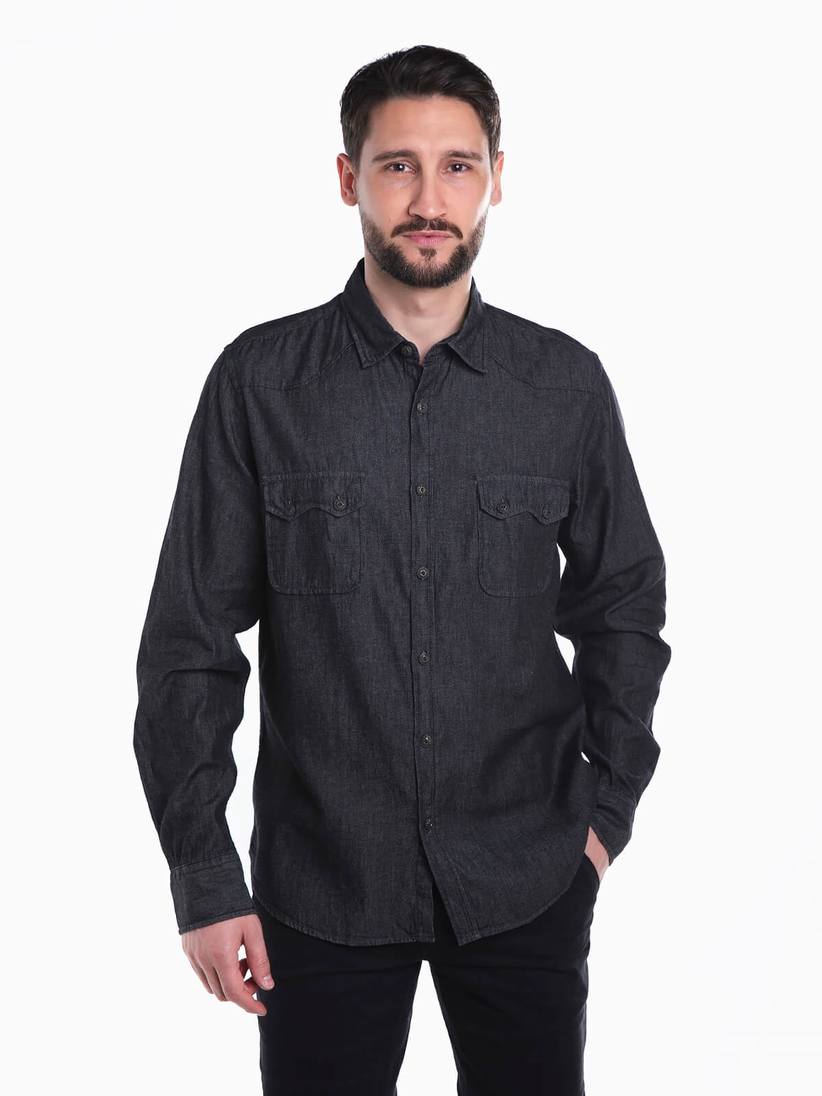 Camisa preta em ganga fina com 2 bolsos no peito. Camisa manga comprida com gola de abas. Punhos abotoados. Aperto de botões.