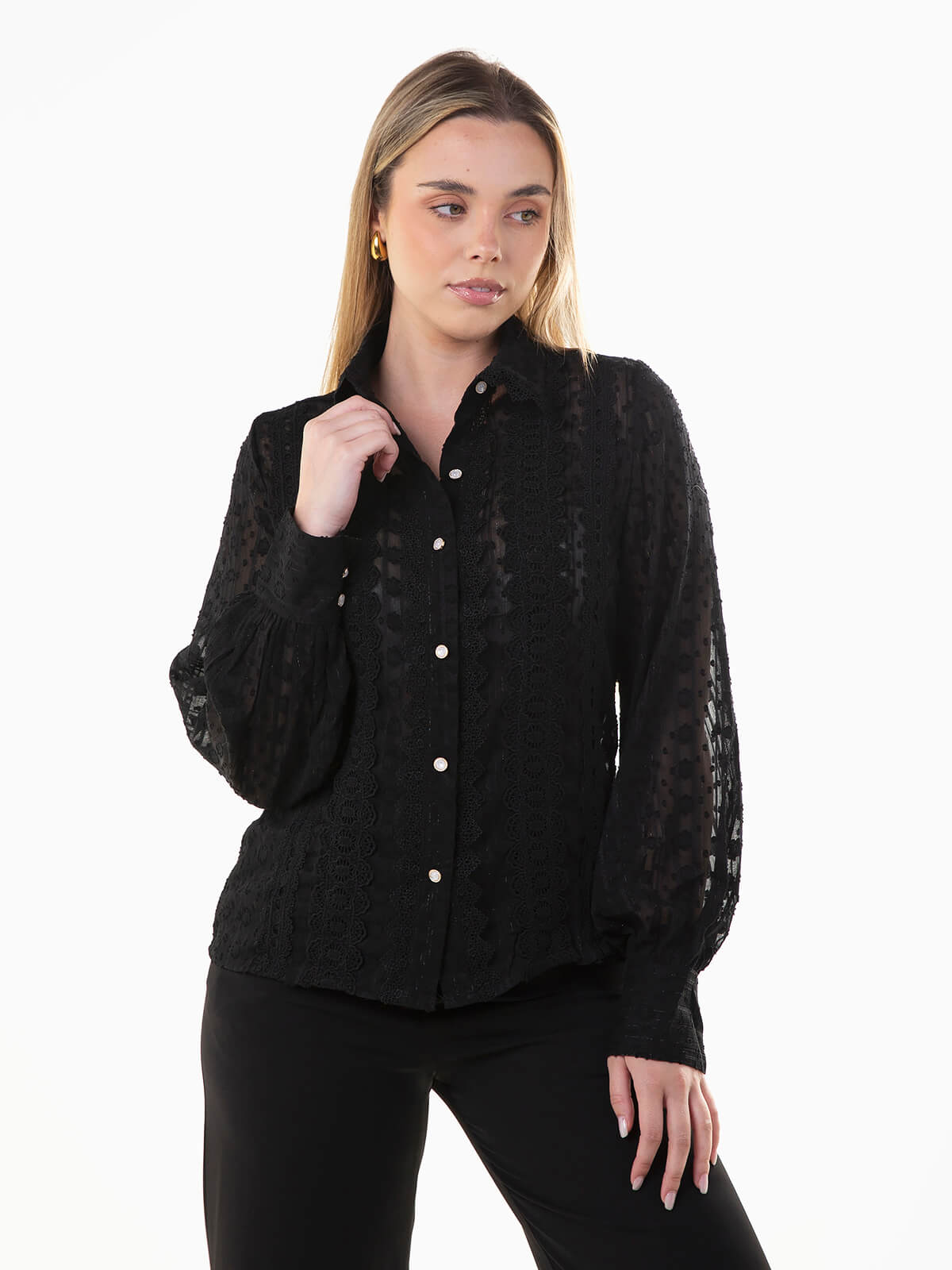 Camisa preta semitransparente combinada com pormenores em renda e fio luréx para efeito brilhante. Camisa romântica manga comprida com punhos elásticos e gola abas. Aperto frontal de botões.