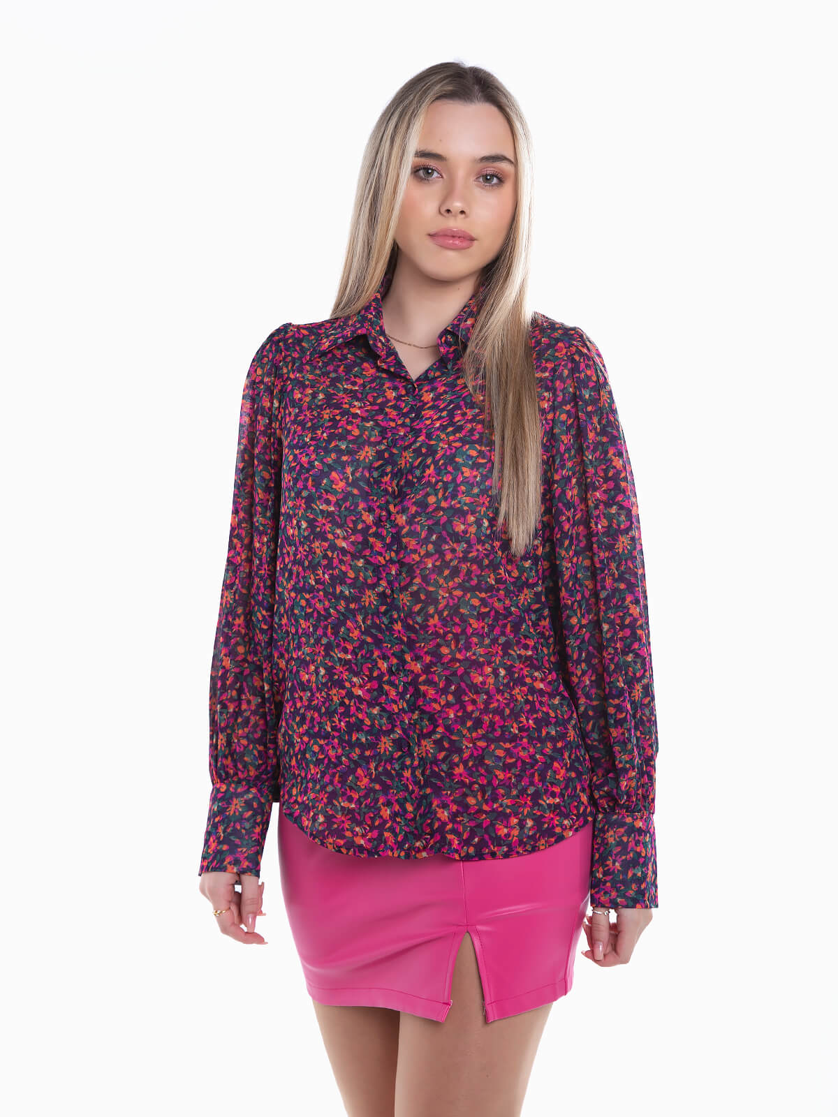Camisa roxa com estampado floral para senhora. Camisa em tecido semitransparente com mangas compridas abalonadas. Gola de abas. Aperto frontal de botões forrados no mesmo tecido.