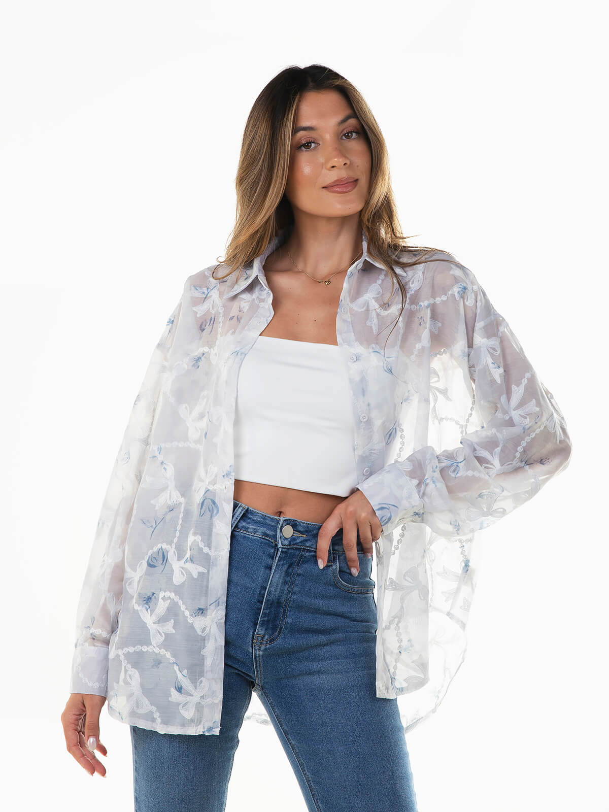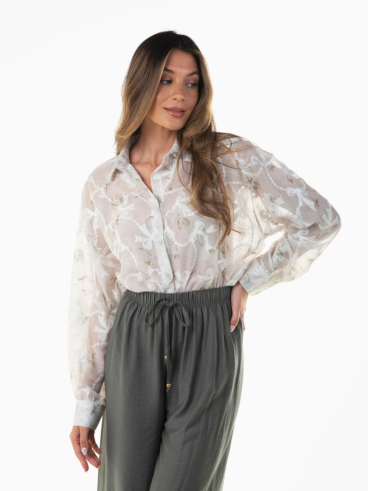 Camisa 100% seda com transparência subtil e pormenores bordados em contraste. Camisa romântica de manga comprida com punhos abotoados e gola de abas. Aperto frontal de botões.