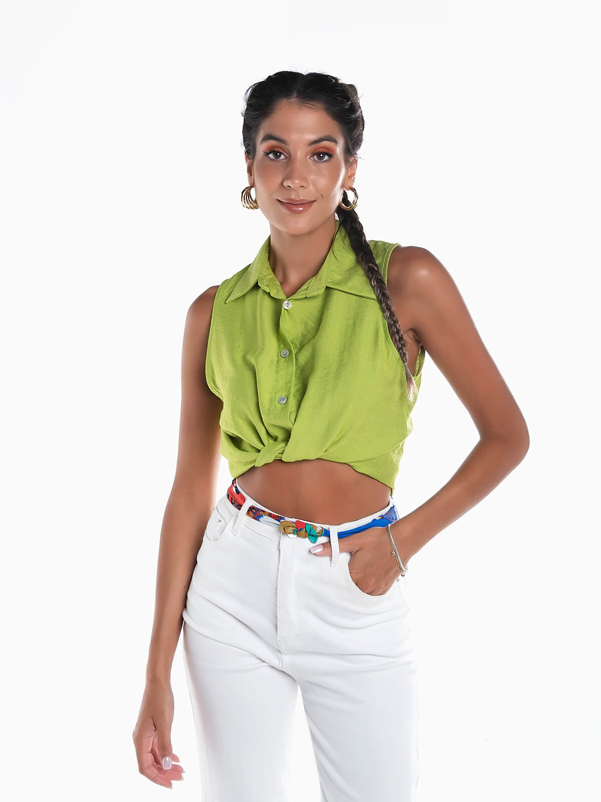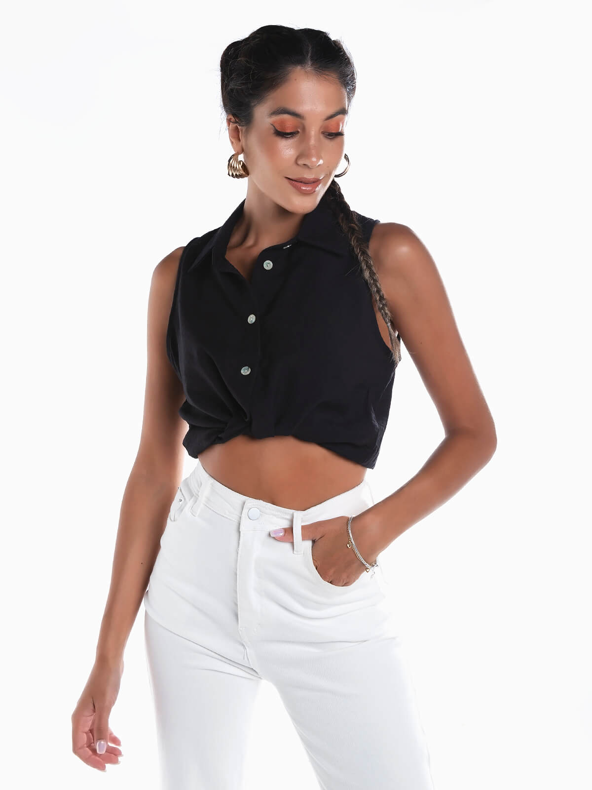 Camisa sem mangas com nó na base. Camisa curta para senhora com gola de abas e aperto posterior de botão.