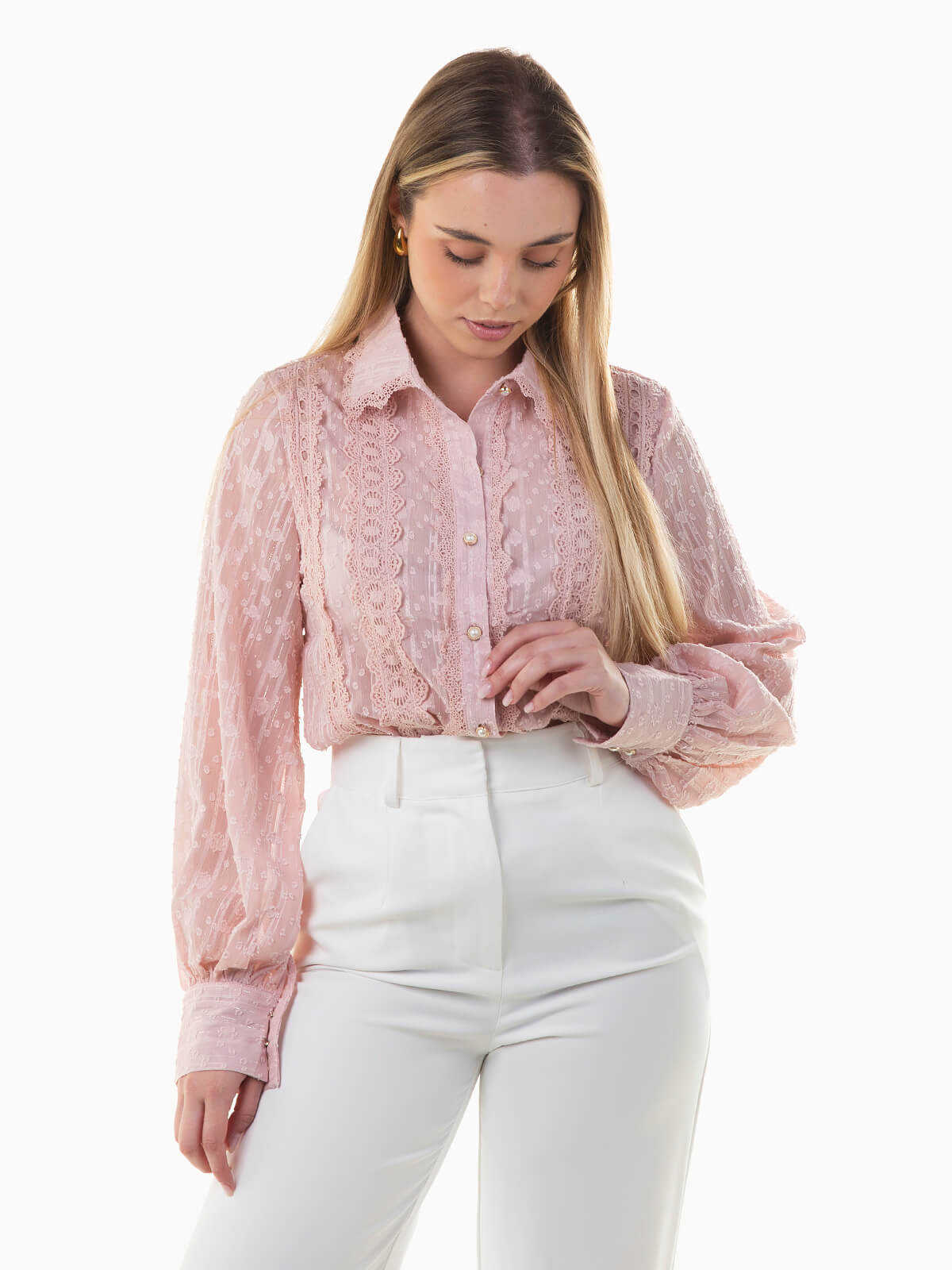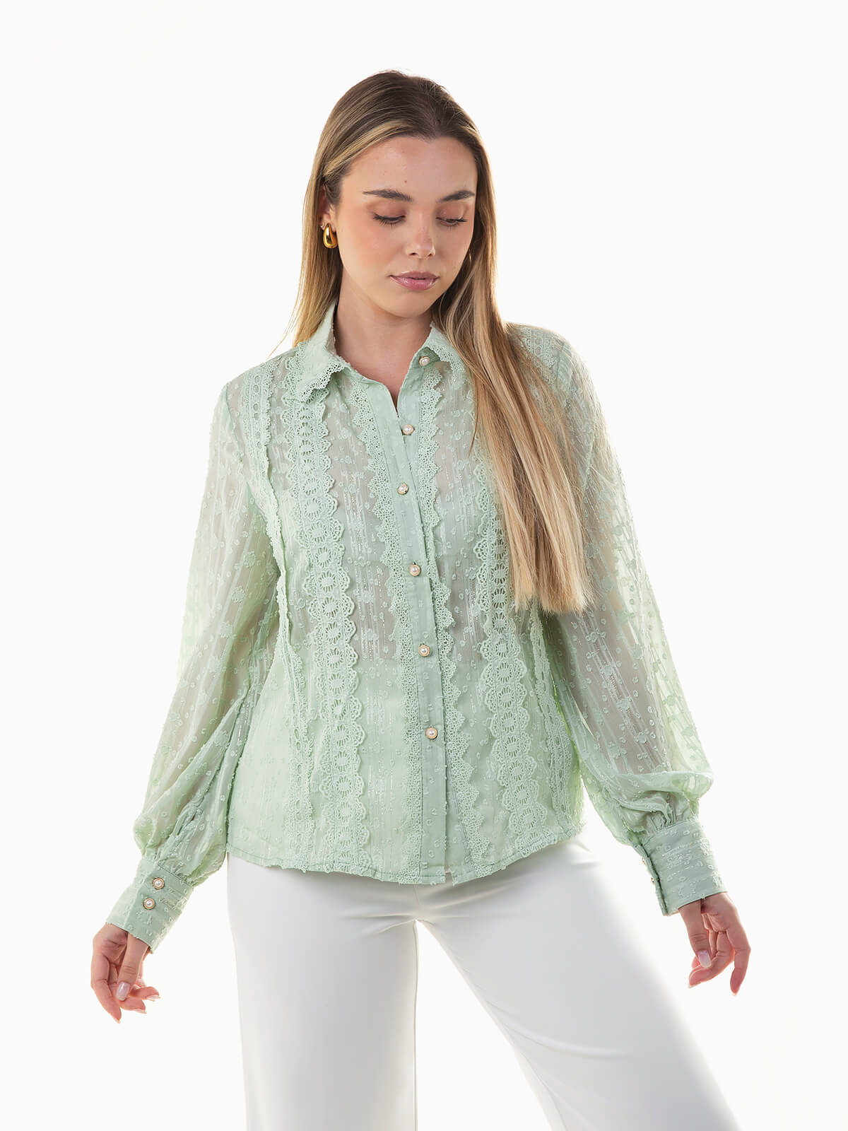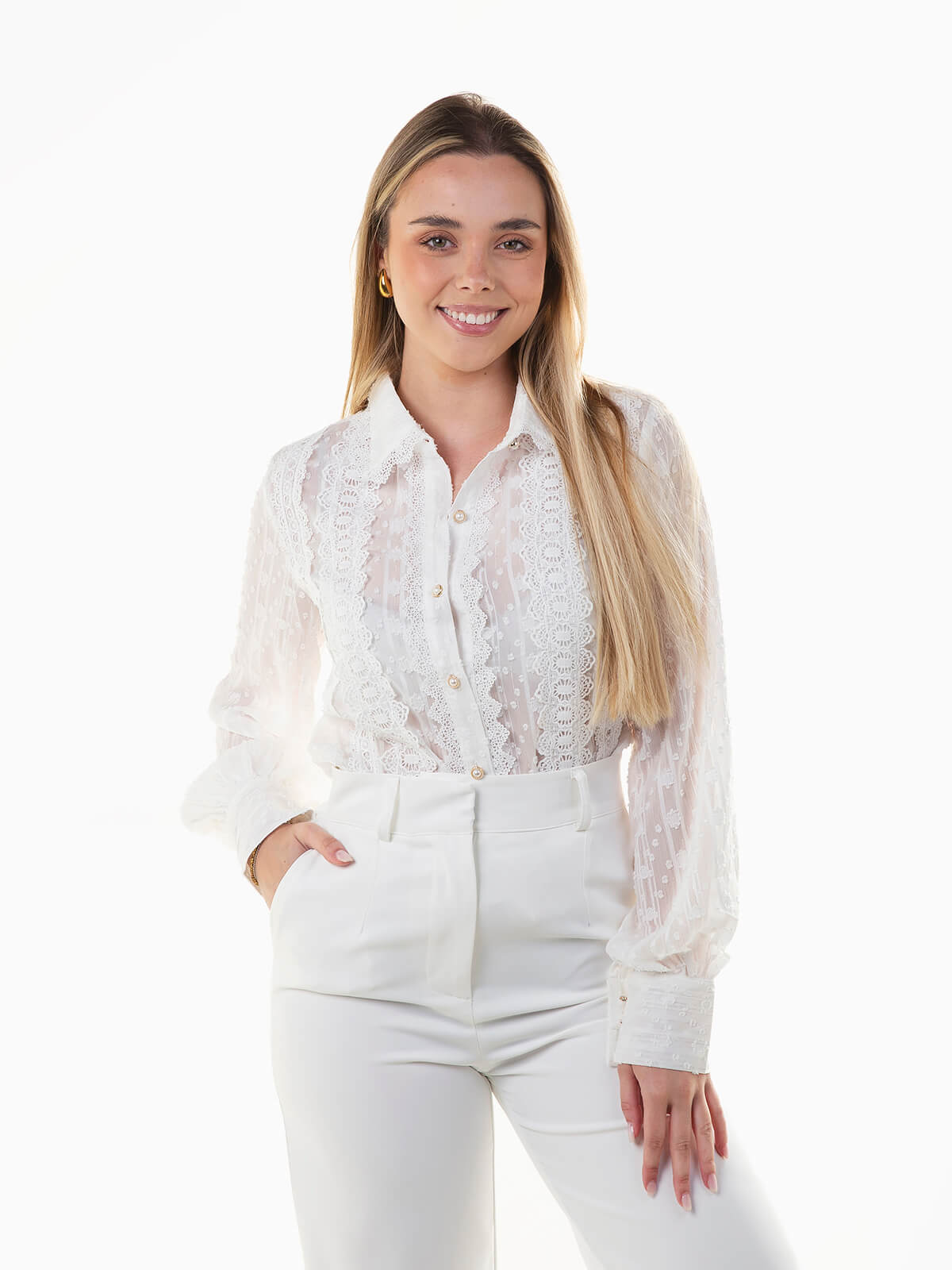 Camisa semitransparente combinado com pormenores em renda e fio luréx para efeito brilhante. Camisa romântica manga comprida com punhos elásticos e gola abas. Aperto frontal de botões de pérolas.