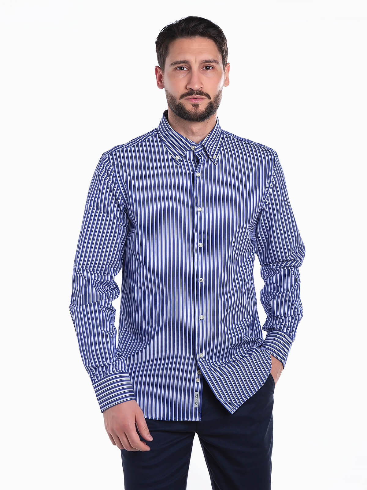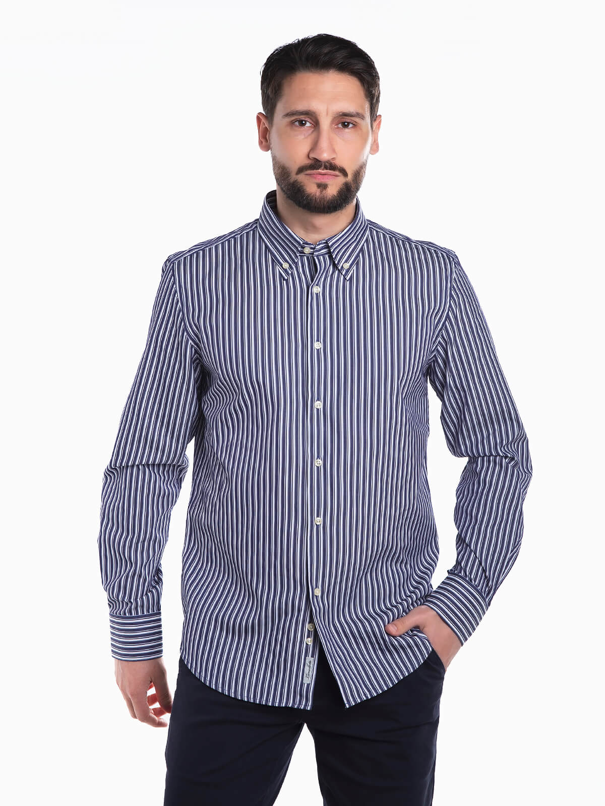 Camisa slim fit às riscas para homem. Camisa manga comprida com punhos abotoados confecionada em tecido 100% algodão. Colarinho americo. Aberto frontal de botões.