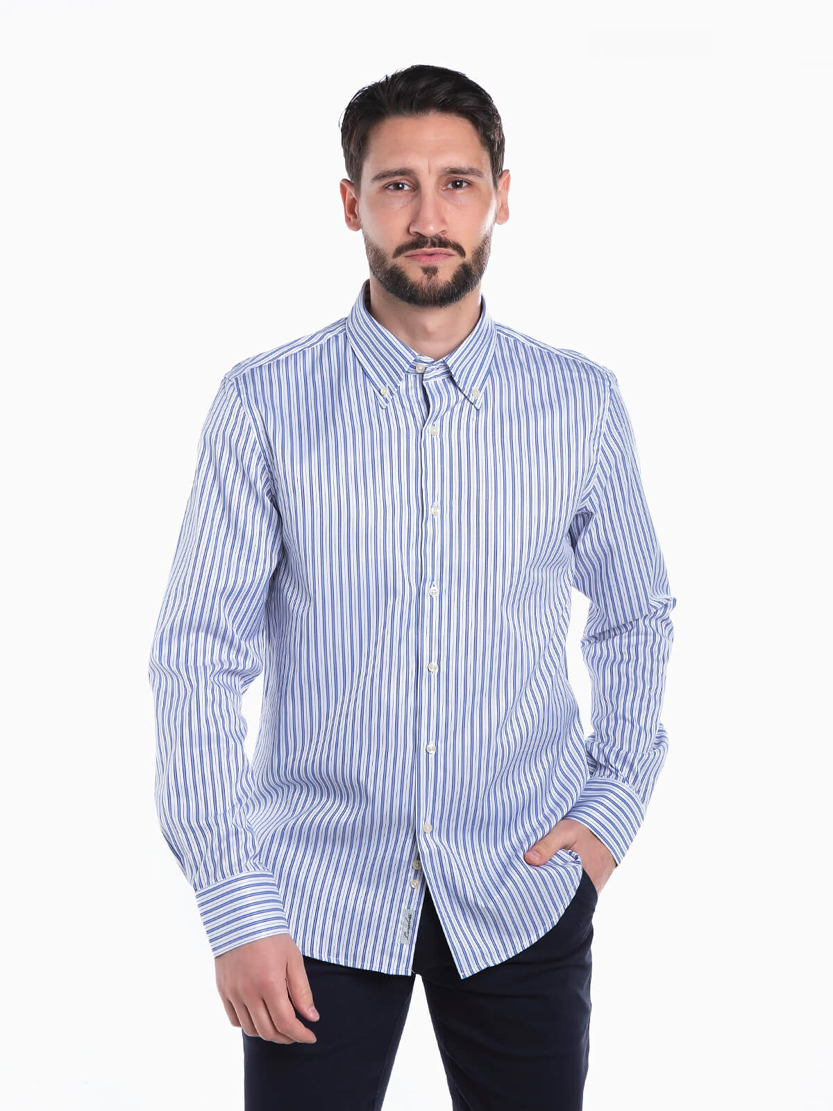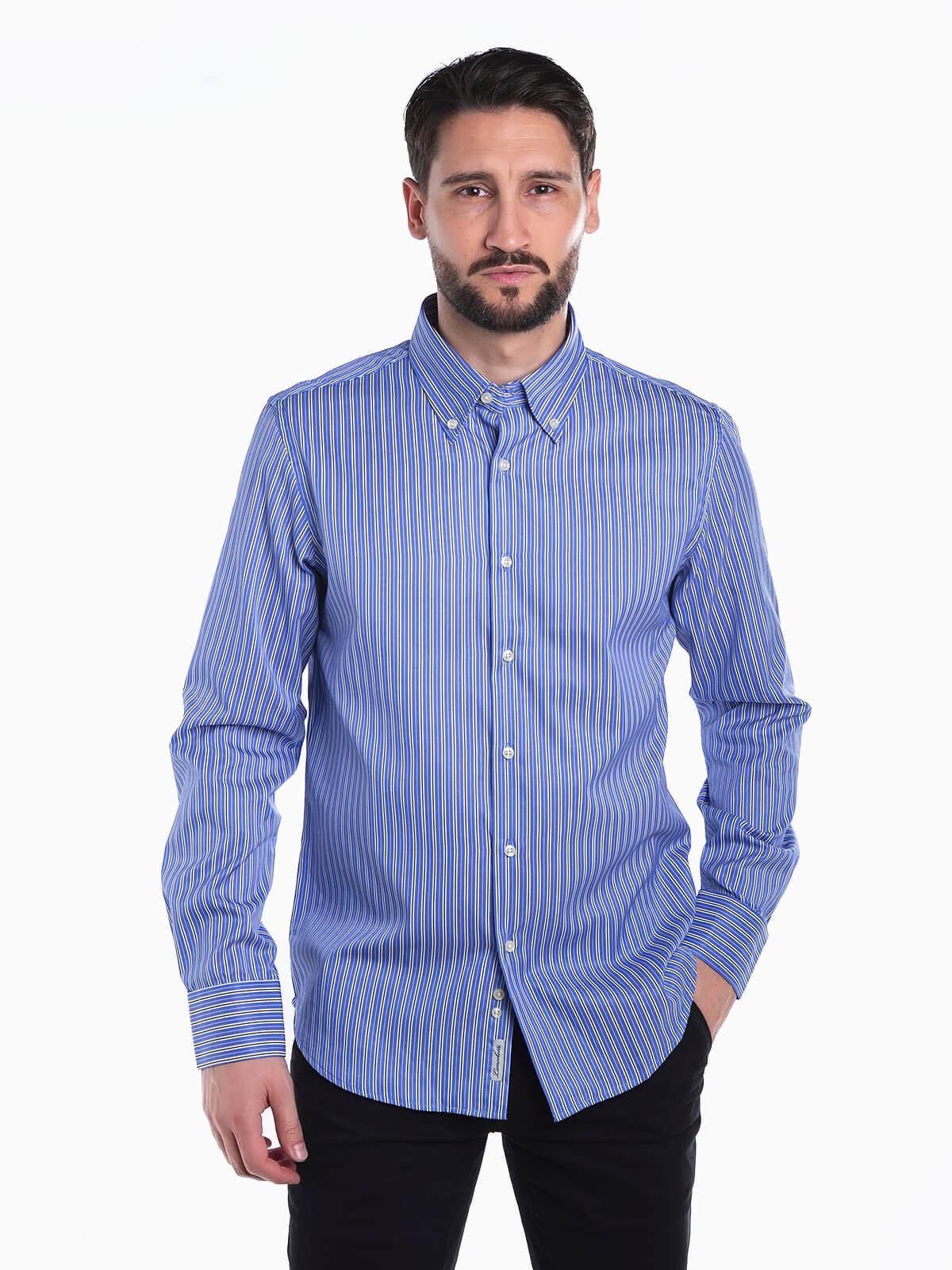 Camisa slim fit com riscas em vários tons. Camisa manga comprida com punhos abotoados e colarinho americano. Aperto de botões.