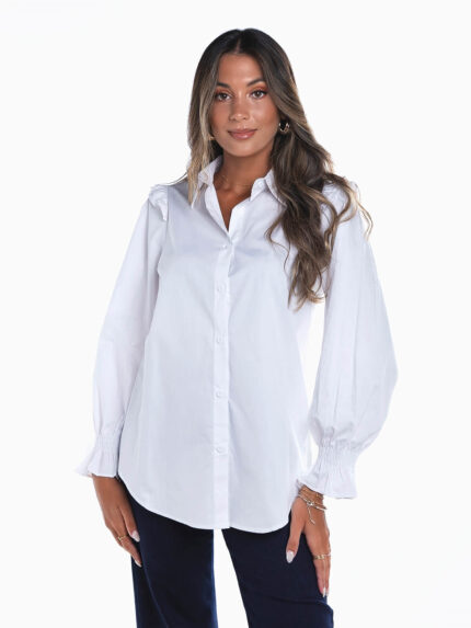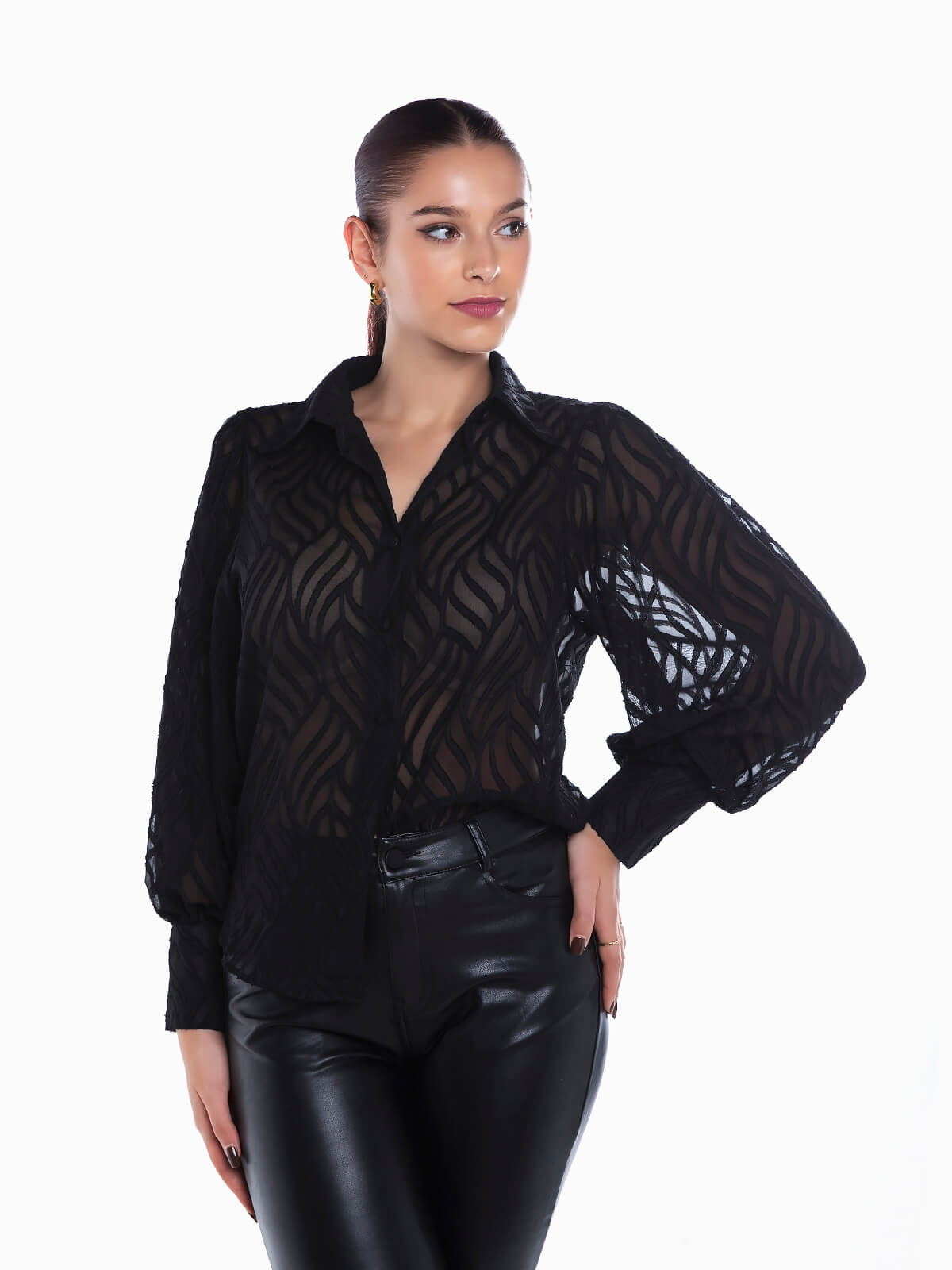 Camisa de tule com relevo para senhora. Camisa semitransparente com manga comprida abalonada. Punhos abotoados. Gola de abas. Aperto frontal de botões forrados no mesmo tecido.