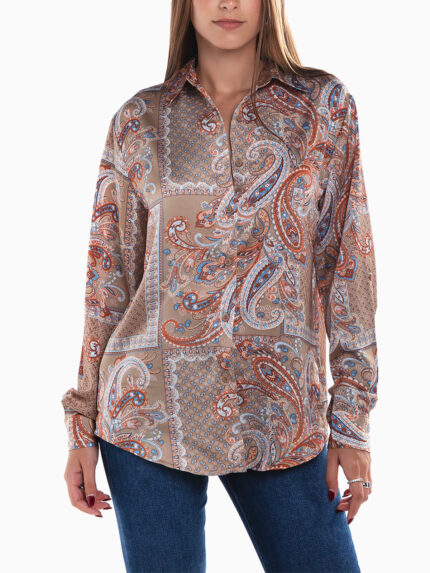 Camisa verde de manga comprida com estampado em contraste. Camisa fluída com fios luréx para efeito brilhante. Gola abas e punhos abotoados. Aperto de botões.