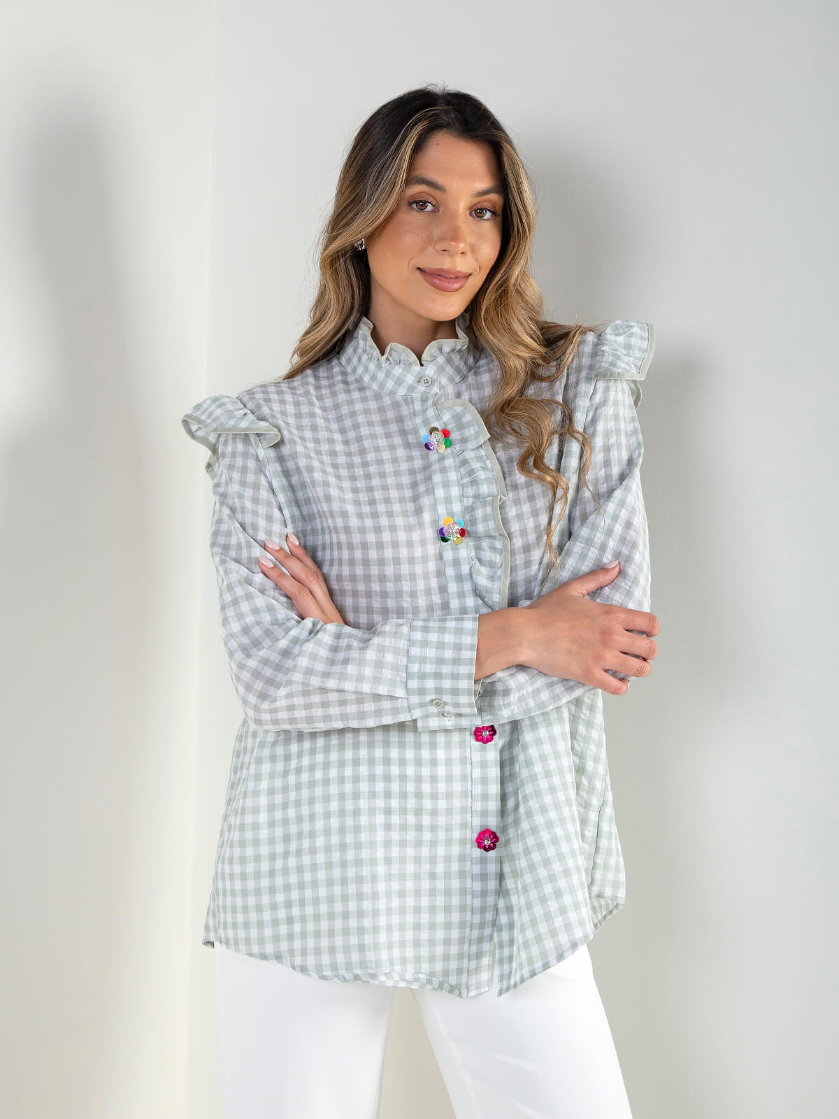 Camisa em padrão vichy com detalhe de folhos na gola e ombros, que acrescenta um toque feminino e atual. Modelo com fecho frontal por botões em destaque, criando um contraste divertido e diferenciador. Uma peça marcante, ideal para elevar looks simples com personalidade.