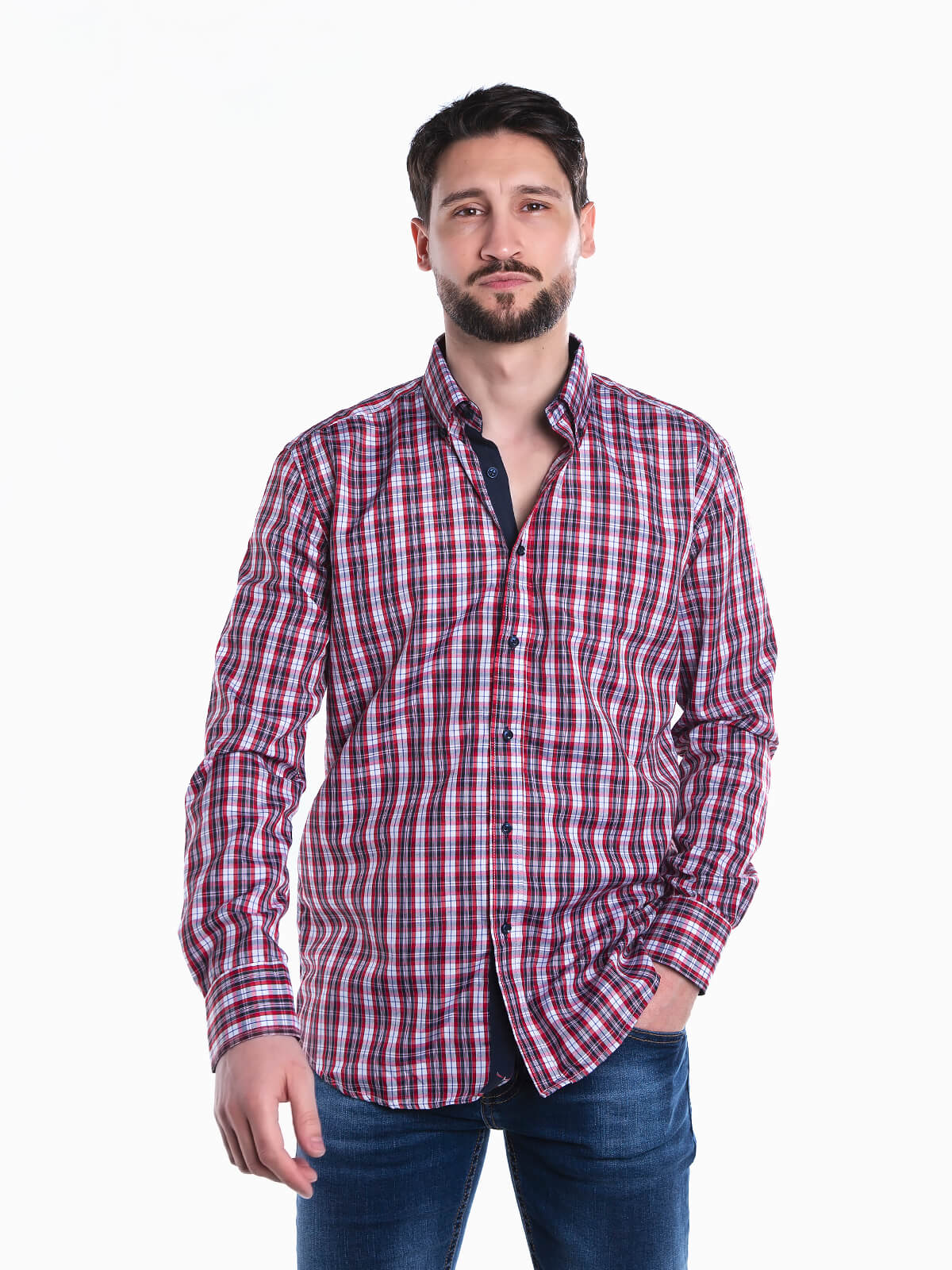Camisa homem regular fit xadrez 100% algodão. Manga comprida com punhos abotoados. Carcela de cor. 1 bolso no peito. Gola de abas. Aperto frontal de botões.