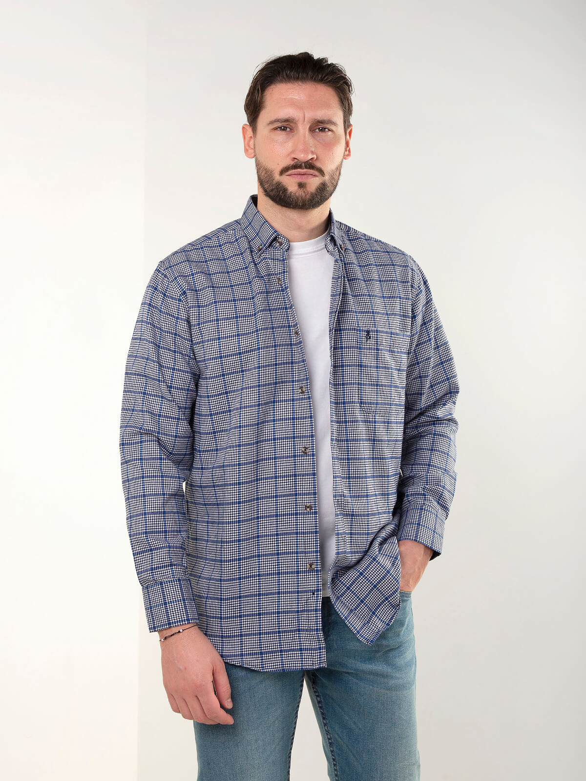Camisa de homem em padrão xadrez, com colarinho americano, punhos abotoados e bolso no peito com símbolo bordado. Confortável e fácil de usar no dia a dia.