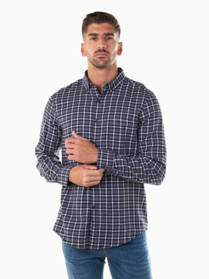 Camisa em xadrez azul marinho para homem. Camisa manga comprida com punhos abotoados e colarinho americano. Bolso no peito. Aperto frontal de botões.