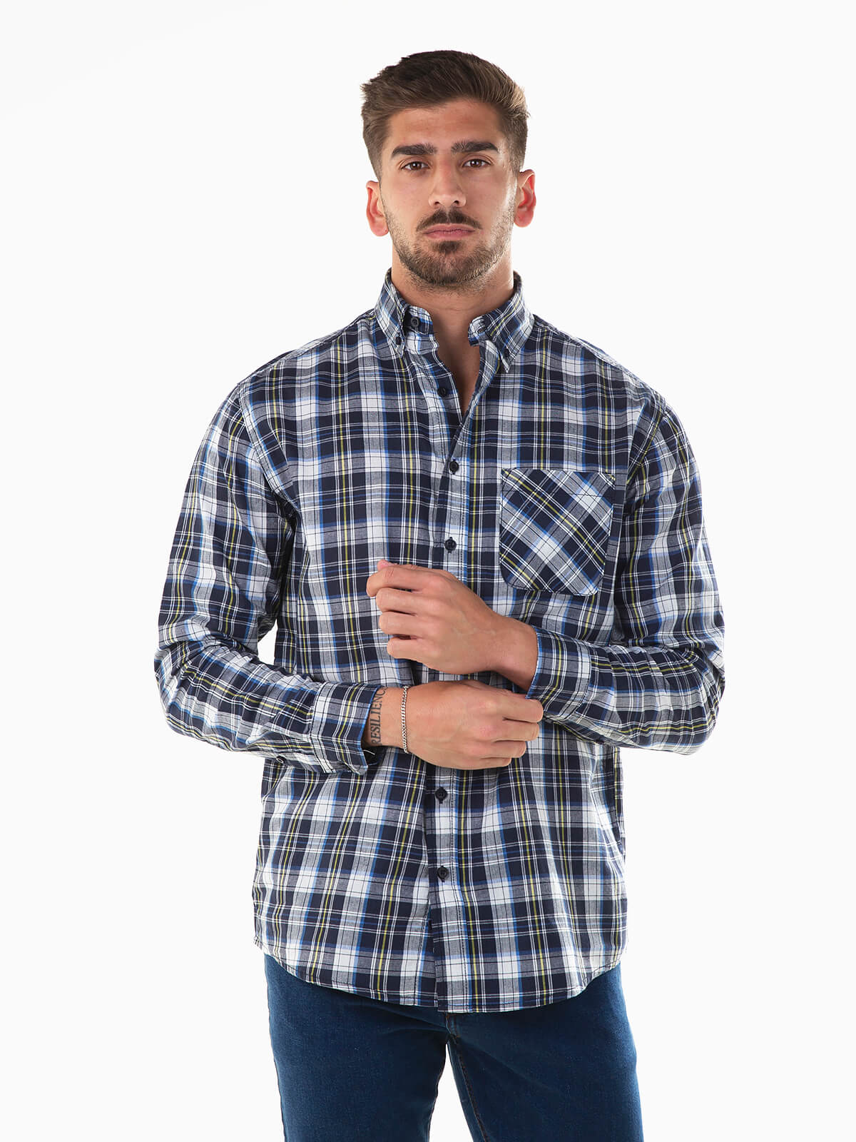 Camisa de manga comprida em xadrez azul marinho para homem. Camisa 100% algodão com bolso no peito e punhos abotoados. Colarinho americano. Aperto frontal de botões.