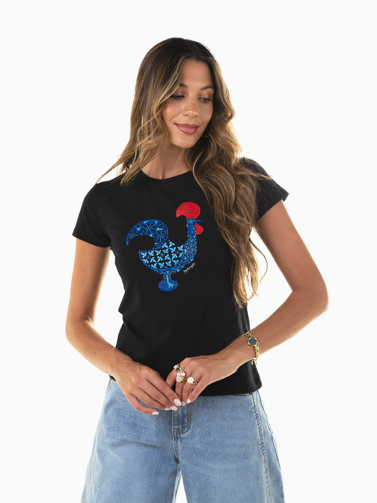 T-shirt de manga curta com estampado de galo inspirado em motivos tradicionais portugueses e decote redondo. Uma peça leve e confortável, perfeita para dar aquele toque especial e cheio de personalidade aos teus looks de verão.
