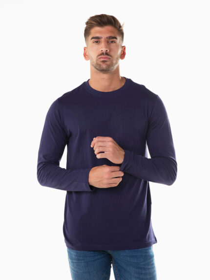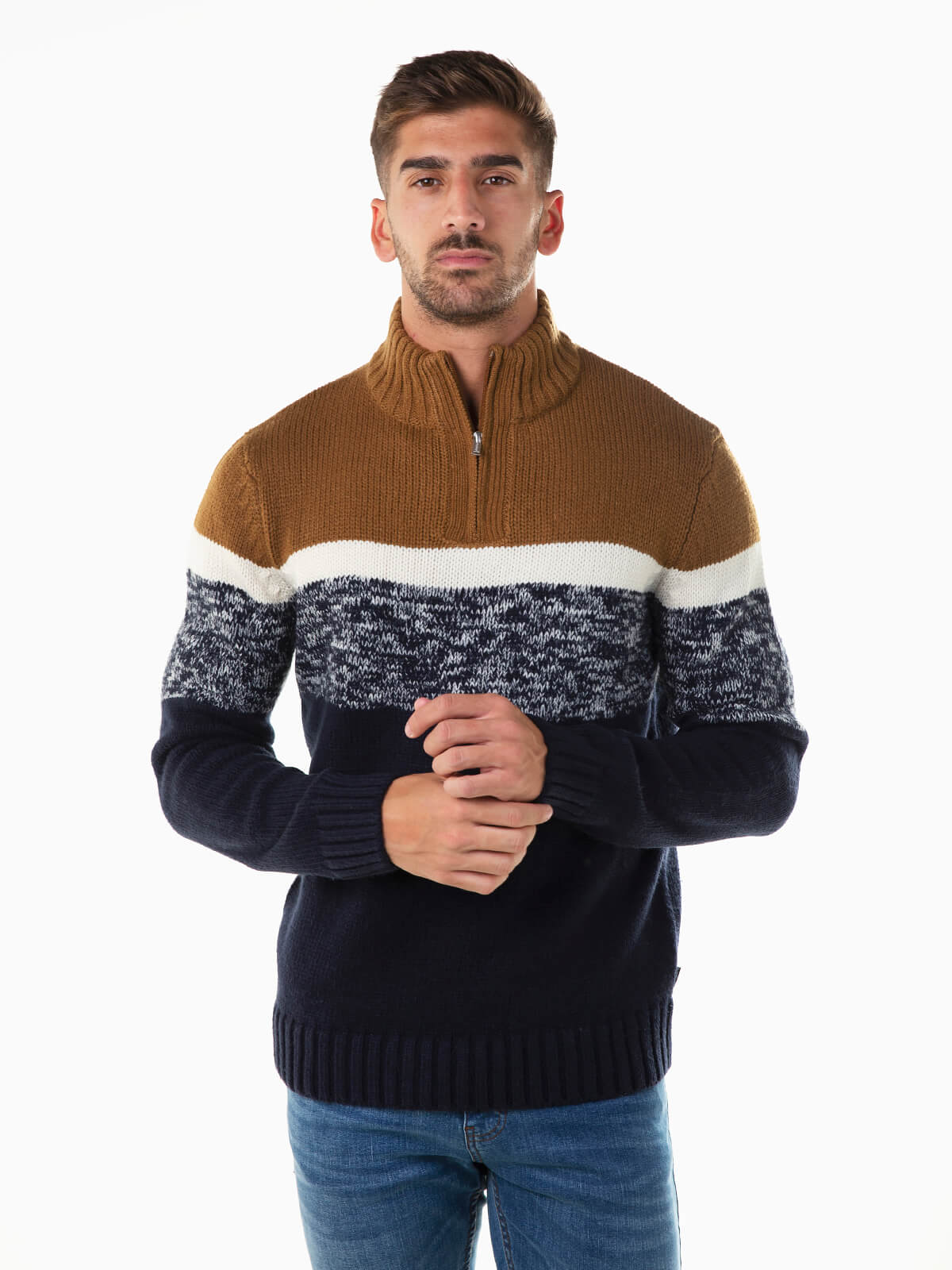 Camisola azul marinho em malha com color block. Camisola manga comprida com gola alta e aperto fecho zíper. Acabamentos canelados.