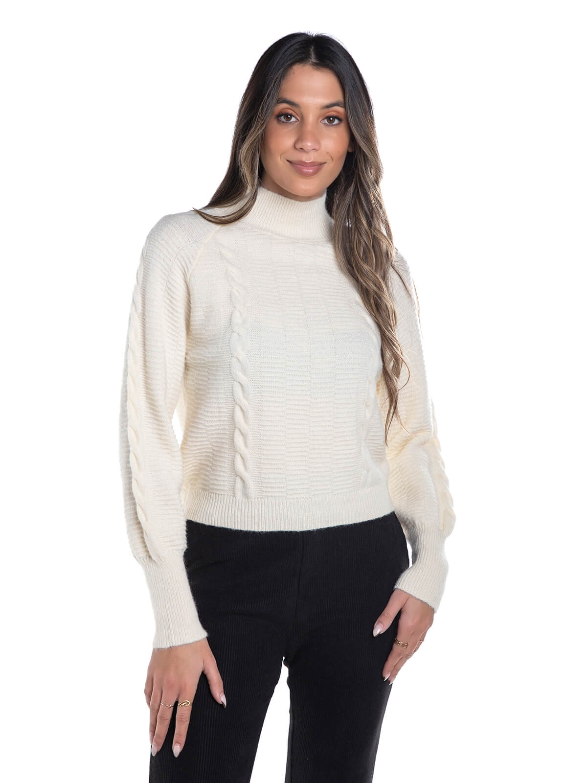 Camisola bege claro em malha estruturada para senhora. Camisola manga comprida com gola subida. Acabamentos em nervuras.