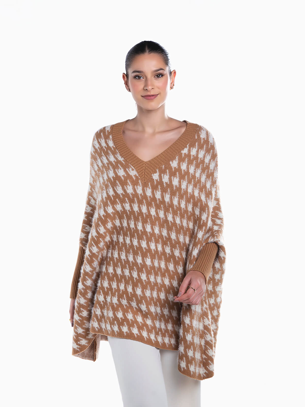 Camisola bege de malha com estampado pied-de-poule. Camisola larga com decote em bico e punho justo. Acabamentos canelados. Corte comprido.
