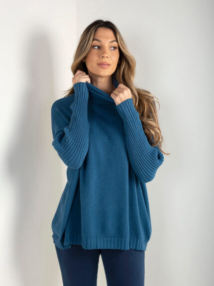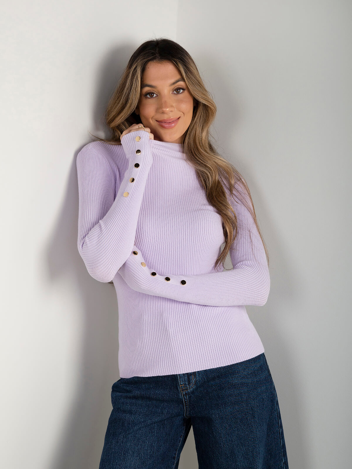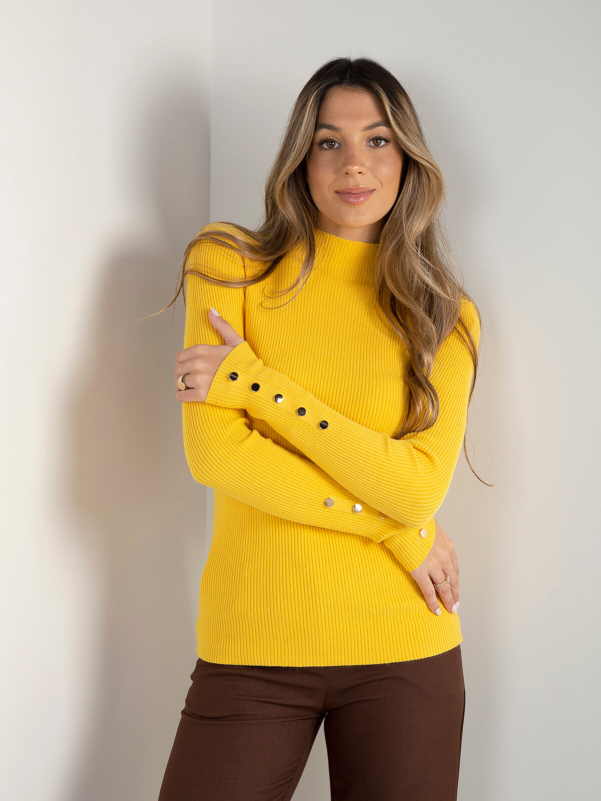 Camisola de malha canelada com gola perkins, manga comprida e detalhe de botões decorativos no punho. Modelo justo, confortável e perfeito para looks modernos com um toque elegante.