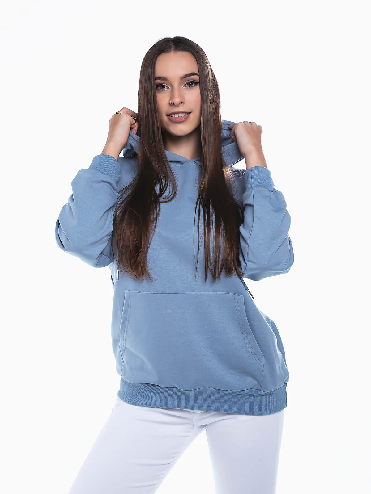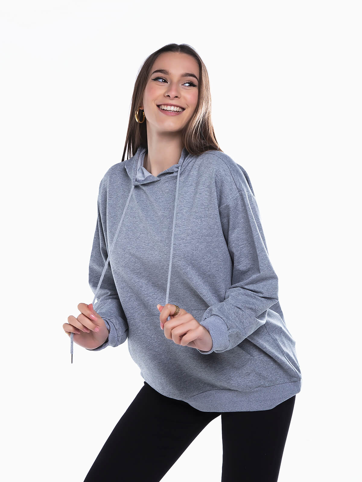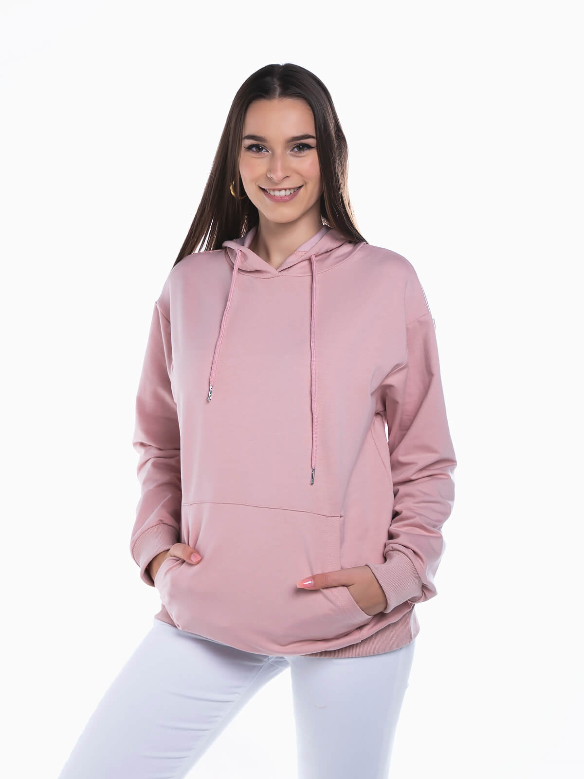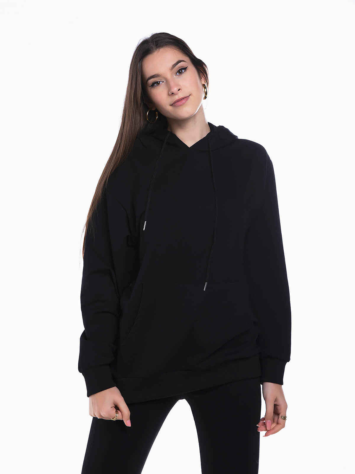 Camisola com capuz básica para mulher. Ombros descaídos. Bolso canguro. Capuz com cordão. Extremidades elásticas.