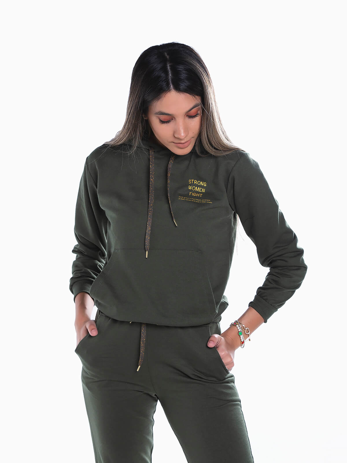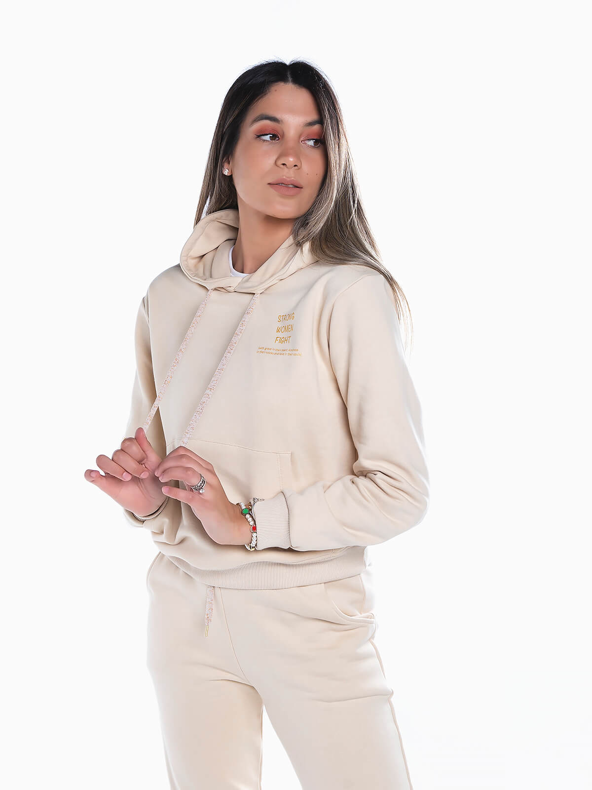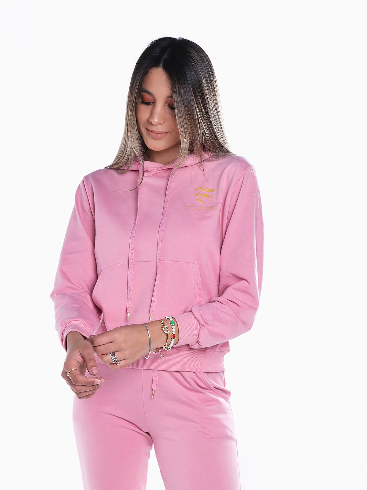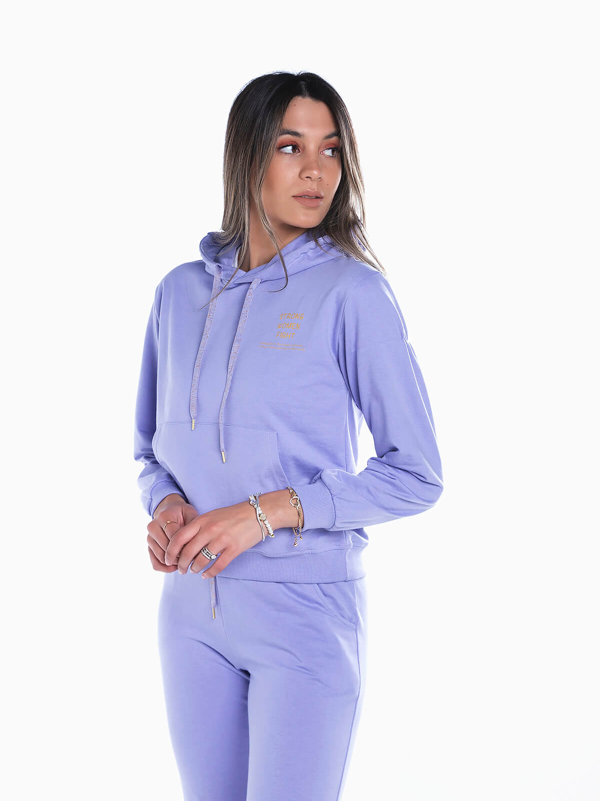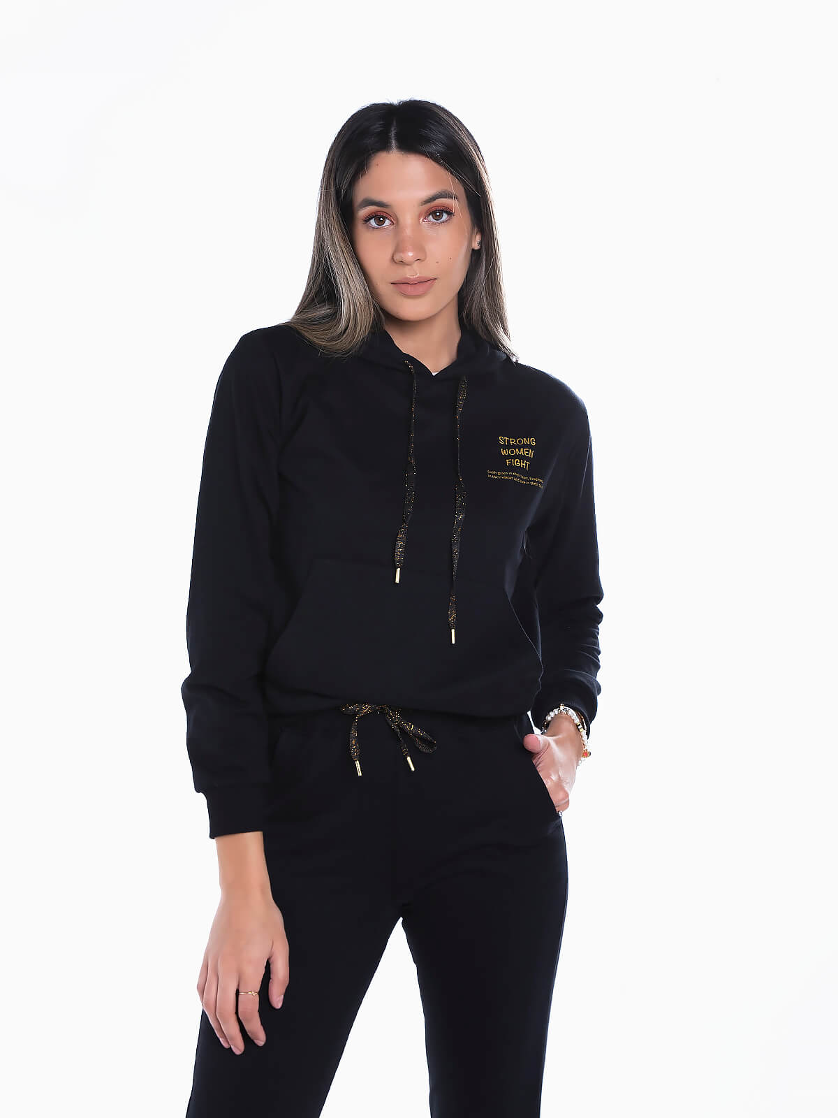 Camisola com capuz e estampado de letras no peito. Sweatshirt de manga comprida com bolso canguru. Acabamentos em nervuras. Capuz com cordão em fios dourados para ajustar.